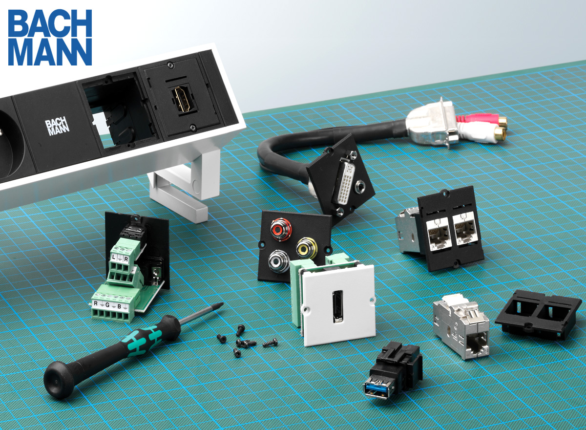 (pressebox) (Wedel, 10.06.2020) Mehrfachsteckdosen und Anschlussfelder von Bachmann lassen sich durch Custom Module (Keystones) individuell belegen. Leerfelder in den Steckdosen werden flexibel mit Bausteinen für Video-, Audio- und Netzwerkverbindungen ausgestattet. Im Online Shop bachmann24.com sind individuell zusammenstellbare oder vorkonfigurierte Custom Module erhältlich.