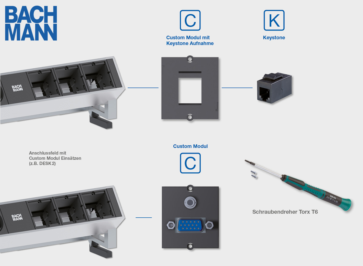 Ein Großteil der Mehrfachsteckdosen von Bachmann verfügen über sogenannte Leerfelder. Die Leerfelder werden individuell mit Custom Modulen (Keystones) belegt und am Tisch als Tischanschlussfelder verbaut. Die Bachmann Keystones realisieren Konfigurationen für jede Anforderung an Medientechnik und Netzwerkverbindungen. Die standardisierten Anschlusselemente, wie zum Beispiel USB-C, Cinch, HDMI Anschlüsse, (Mini-) Klinke, VGA, CAT, RJ45 oder Strom, können durch Einrasten in dafür bestimmte Keystone Rahmen installiert werden. Dank seiner Bauform hat das Custom Modul eine hohe Flexibilität und kann ohne spezielles Werkzeug in nahezu allen Steckdosenleisten von Bachmann montiert werden. Unter anderem bieten die Bachmann Tischanschlussfelder Venid, Conference, Top Frame, Coni, Coni Duo, Coneo, Power Frame, Kapsa, Due, Pix, Lift, Desk 2, Desk Rail und Desk 1 sowie in den Steckdosenleisten Step und Universal diese Leerfelder für die individuelle Bestückung an.