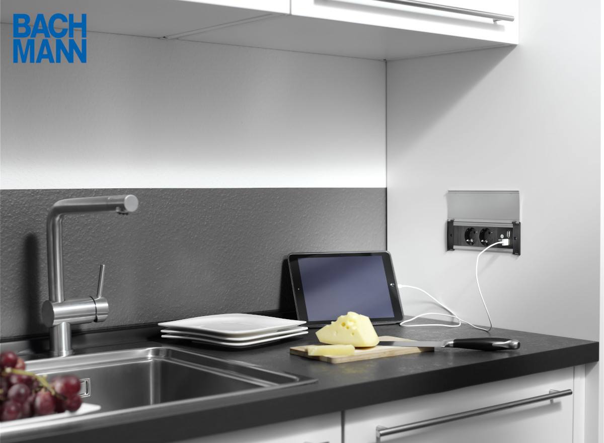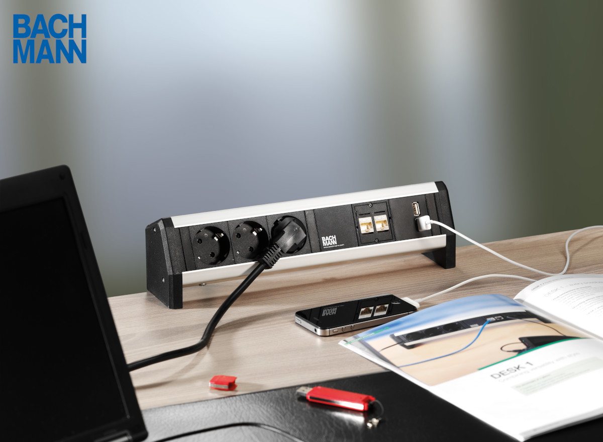„Für eine möglichst effiziente und elegante Lösung, bei der die Räumlichkeit trotz Einsatz vieler Endgeräte optisch clean aussieht, bieten sich die Anschlussfelder und Mehrfachsteckdosen von Bachmann perfekt an“, führt Groth fort. Dazu zählen Steckdosenleisten, die zum Teil per Knopfdruck im Tisch versenkbar sind und in Konferenzräumen / Hotels, an Schreibtischen in Büros sowie in der Küche oder im Bad des privaten Wohnraums ihre Anwendung finden. Die Steckdosenleisten lassen sich als Aufbau / Aufsatz am Schreibtisch oder als Einbau in Möbeln versenken und können je nach Bedarf individuell mit Bild- und Ton- oder Netzwerkanschlüssen bestückt werden. An den Tischanschlussfeldern am Konferenztisch oder Rednerpult werden via USB-C externe Geräte wie beispielsweise Tablets, Notebooks oder Smartphones mit Strom versorgt / aufgeladen. Zudem verschwinden unnötige Anschlusskabel aus dem Blickfeld.