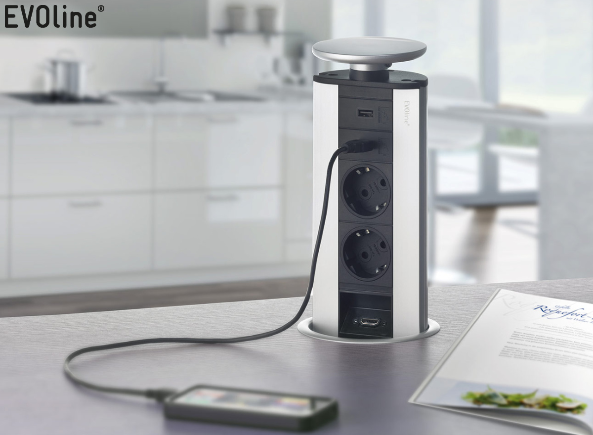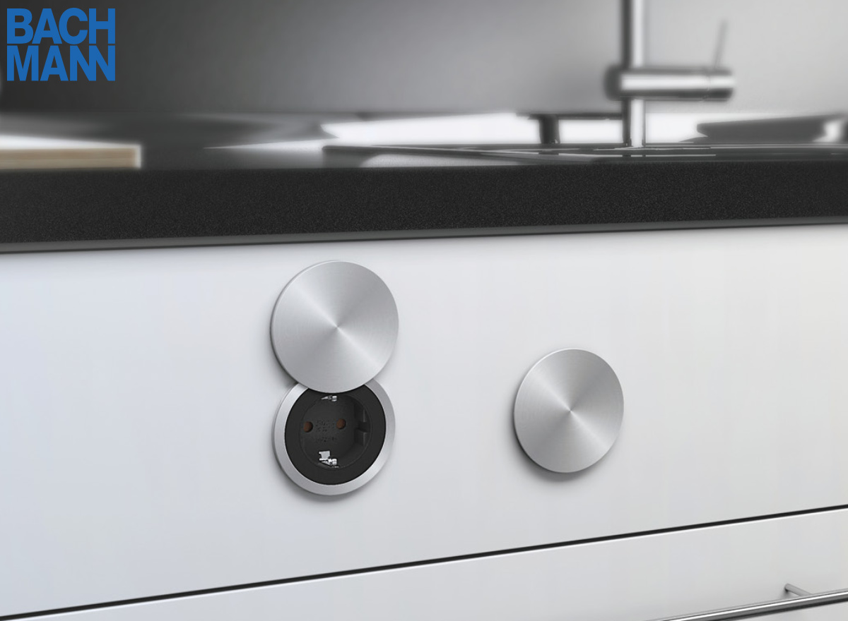 Eine Wohnküche verbindet als Mittelpunkt des Zuhauses die verschiedenen Lebensbereiche. Hier wird mit der Familie und Freunden gekocht, gegessen, gefeiert und kommuniziert. Technische Küchenhelfer erlauben es, Funktionalität und Gemütlichkeit harmonisch zu vereinen. Leicht zugängliche Tischanschlussfelder für Strom und Daten sorgen für Komfort, Lifestyle und modernes Design. Die versenkbaren Einbausteckdosen von den Herstellern Bachmann und EVOline lassen sich mit einem Fingerdruck aus der Arbeitsplatte hervorholen. Einige Mehrfachsteckdosen verfügen zudem über Leerfelder, die beliebig mit USB-C, Strom, HDMI oder CAT Anschlüssen bestückt werden können. Ebenfalls von Bachmann stammen die Einbaulautsprecher INTUBLU, die aus einem Bluetooth-Netzteil und zwei Körperschallwandlern bestehen. Werden diese in Küchenmöbel eingebaut, schwingen die Oberflächen als Resonanzkörper und die Lautsprecher können unsichtbar den Soundtrack zum Kochen liefern.