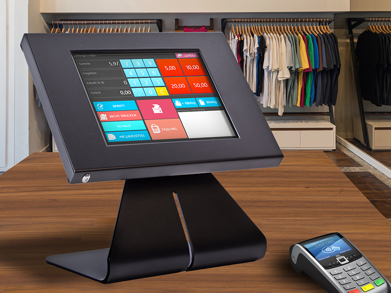 Durch Kombinationen der TabLines Produkte wird beispielsweise mit einem Tablet Schutzgehäuse (TSG) und einem neigbaren Tablet Tischständer (TTS) ein Kassensystem generiert. Dieses Kassensystem ist handlich und mobil und durch die Möglichkeit den Tischständer anzuschrauben, wird die Kasse diebstahlsicher platziert.
