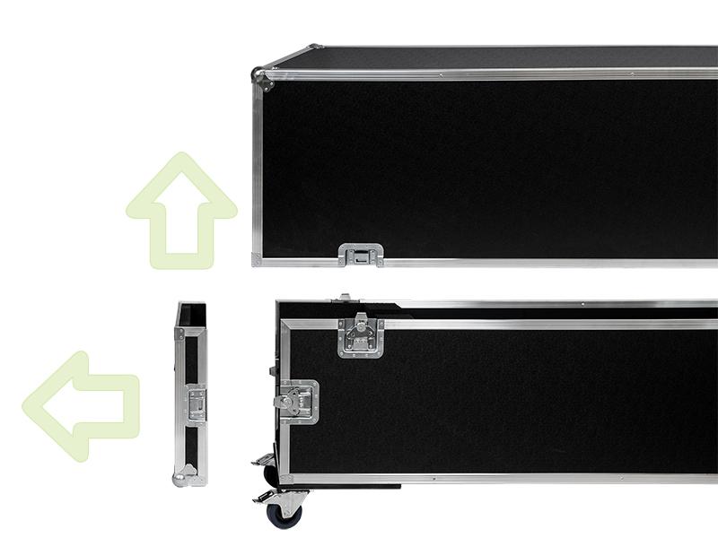Für einen Kunden stellte MonLines beispielsweise einen maßgefertigten Transportkoffer für eine zwei Meter hohe Monitorstele her. Durch die 3-teilige Bauweise der Transportbox kann zunächst der Deckel und anschließend zusätzlich eine Seitenabdeckung abgenommen werden. Auf diese Weise kann die Display Stele ganz unkompliziert aus dem Stand im Hochformat einfach durch die geöffnete Seite in das Transportcase gelegt werden. Ein schweres Hochheben der massiven Stele entfällt somit komplett!