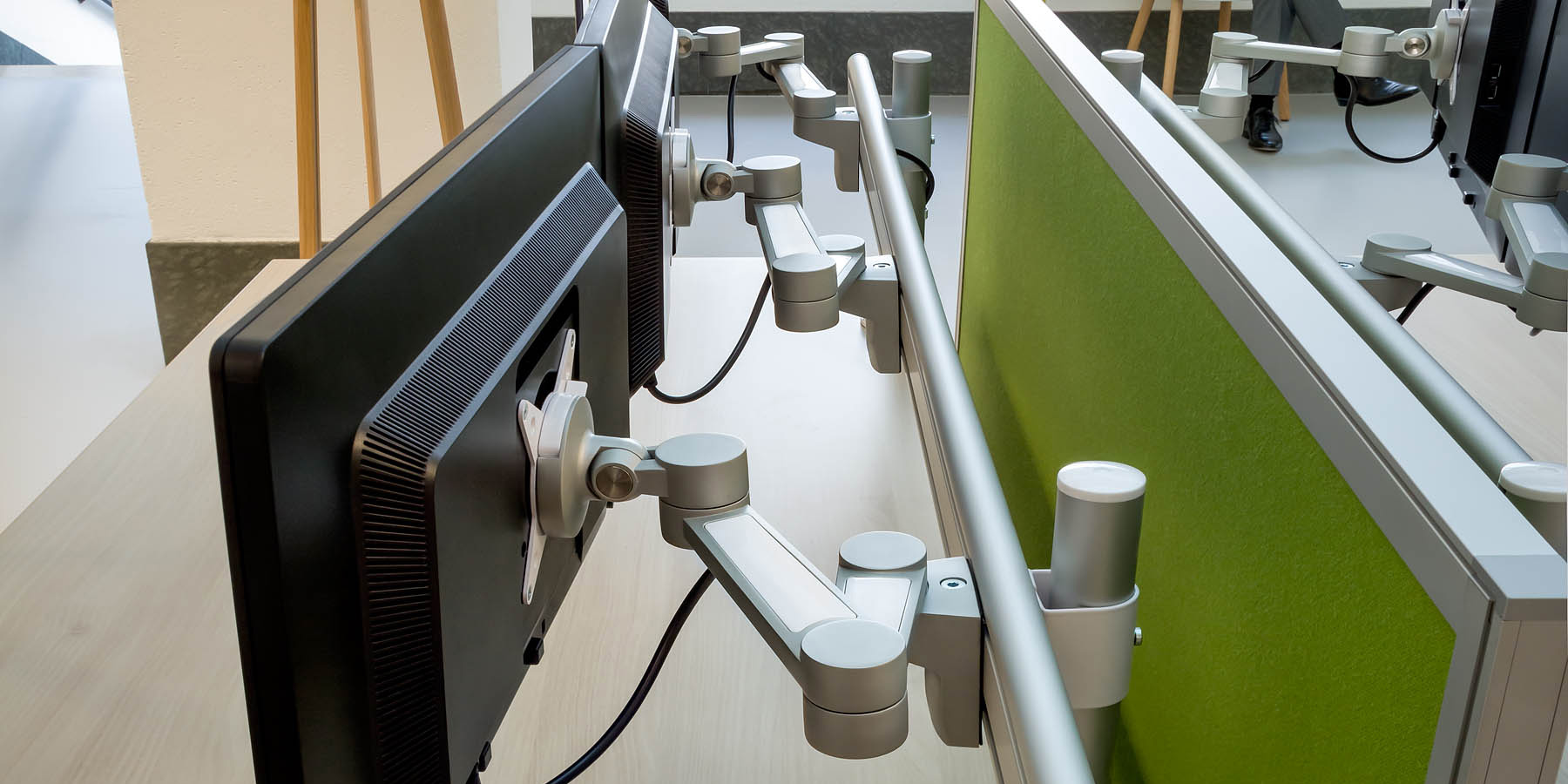 Die Monitorarme von Dataflex Viewlite Plus verhindern durch die Funktion der Schwenkblockade ein Anstoßen an Wände oder an andere Tische der Kolleginnen und Kollegen. Die Monitore können per VESA Aufnahme stabil befestigt werden. Für den sauberen Look sorgen die Aluminiumausleger, in der die Kabellage verschwindet. Die Plug & Play Funktionen der Dataflex Viewlite Dockingstationen bieten die Möglichkeit den Laptop, einen Monitor oder USB-Geräte schnell anzuschließen. Der Arbeitsplatz kann von mehreren Mitarbeitern im Schichtdienst z.B. benutzt werden (desk sharing). Die Schienensysteme und die PC Halterungen sorgen durch das Kabelmanagement für einen aufgeräumten und individuellen Arbeitsplatz. „Die Reinigung und die Wartung der Arbeitsplätze haben sich durch die Dataflex Viewlite Produkte erheblich vereinfacht. Die Reinigungskräfte benötigen in den Büroräumen weniger Zeit und Mühe für die Reinigung“, so der Geschäftsführer Dipl.-Inf. Steffen Groth von dem Shop www.dataflex.shop.