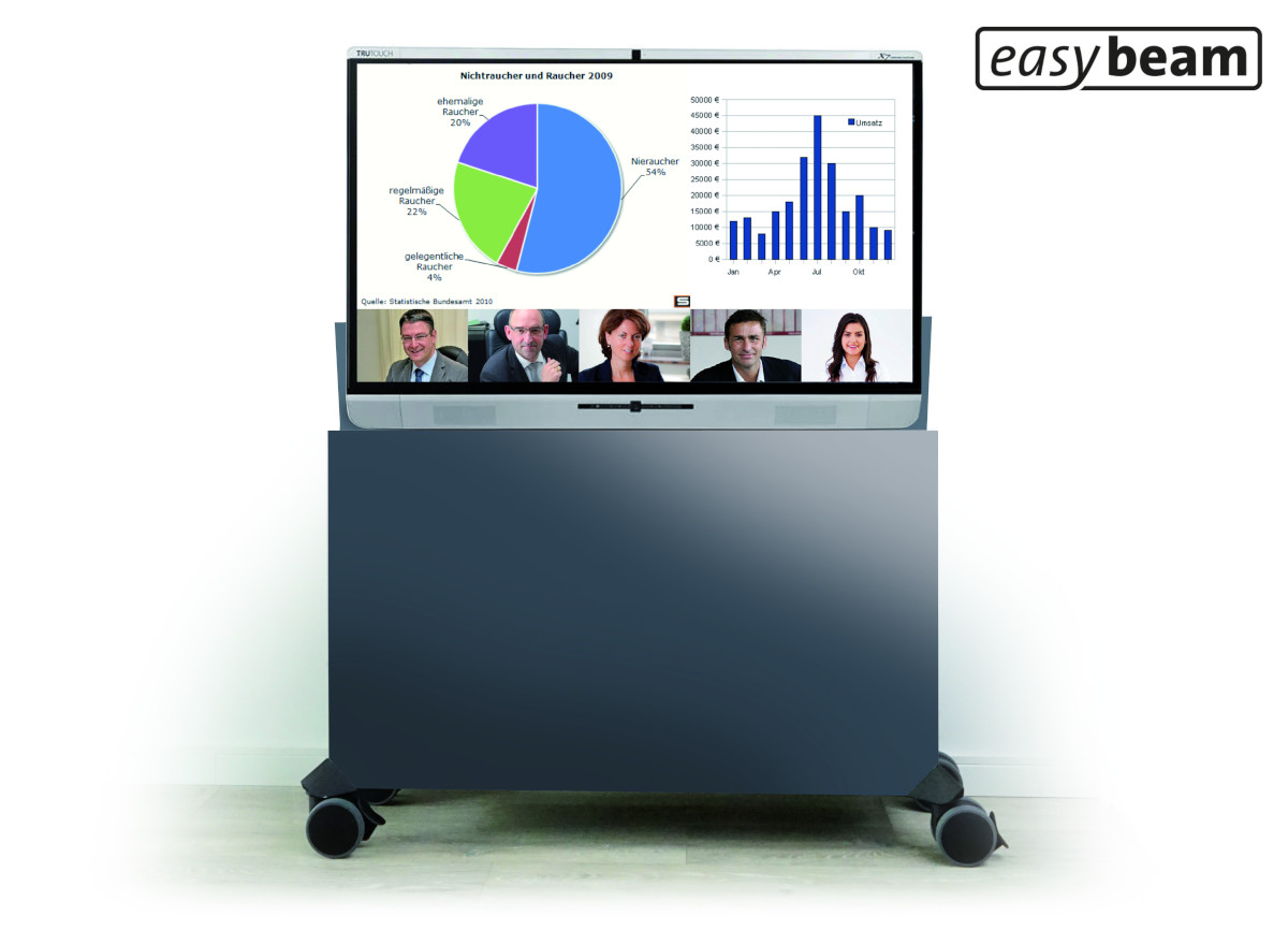 Das mobile Display Sideboard SOLO von easybeam ist mit einem motorisierten TV Lift ausgestattet und eignet sich für Schulungen, Workshops und Präsentationen in Schulen oder Firmen, Behörden, Universitäten oder für den privaten Gebrauch. "Hochwertige Bildschirme werden immer größer und kommen zunehmend in Konferenzräumen oder privat zum Einsatz. Störend ist allerdings oft die große schwarze Fläche im Raum. Mit dem mobilen TV Sideboard, das mit einem hochwertigen Liftsystem ausgestattet ist, können große und schwere Flachbildschirme mühelos von Raum zu Raum auf Rollen transportiert werden", erklärt Dipl.-Inf. Steffen Groth von der BTS Business Trading Shops GmbH. Das Konzept von easybeam kann als Baukastensystem modular nach Wunsch zusammengestellt werden. Das Kernmöbelstück beinhaltet die komplette Technik vom optionalen Lautsprechersystem über das Liftsystem bis hin zur integrierten Kabeltrommel. Neben der Funktionalität und der aufgeräumten Optik besitzt das easybeam SOLO Präsentationsmedium weitere Eigenschaften: Die integrierte Kabeltrommel und die zusätzlichen Anschlüsse USB, HDMI, Innensteckdosen und eine Außensteckdose erleichtern den Einsatz des TV Möbels in allen Räumlichkeiten. Die vier großen Rollen mit Bremsmechanismus und eine VESA Aufnahme sorgen darüber hinaus für Komfort beim Transport und bei der Installation des Bildschirms.