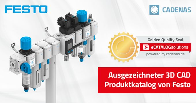 (pressebox) (Augsburg, 20.05.2021) Die Festo SE & Co. KG wurde für ihren umfassenden digitalen 3D CAD Produktkatalog von der CADENAS GmbH mit dem goldenen Katalogsiegel ausgezeichnet. Festo setzt bereits seit vielen Jahren erfolgreich auf den digitalen Produktkatalog basierend auf der eCATALOGsolutions Technologie von CADENAS und schafft damit die Grundlage für digitale Zwillinge seiner Produkte. Der Festo Produktkatalog erfüllt dabei eine ganze Reihe an wichtigen Kriterien, um die Auszeichnung mit dem goldenen Katalogsiegel zu erhalten, wie die Integration eines Produktkonfigurators, eine automatische 2D Bemaßung für CAD Bauteile sowie Produktdaten in mindestens drei Sprachen. Überprüft werden diese Merkmale dabei von der Qualitätssicherung von CADENAS. Aktuell wird das goldene Katalogsiegel bei 24 der über 800 Produktkataloge im Strategischen Teilemanagement PARTsolutions sowie dem 3D CAD Downloadportal PARTcommunity angezeigt.