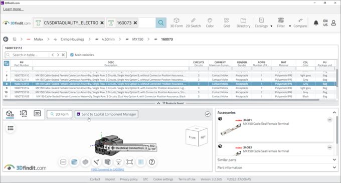 “Engineers spend about 27% of their time searching for components. We help to drastically reduce this effort,” explains Jürgen Heimbach, CEO of CADENAS GmbH. “If users start a search query via the search field in Capital and do not find what they are looking for, the search query is transferred directly by launching 3Dfindit.com. In addition to a parametric text search, a number of intuitive search functions such as shape search, sketch search or color search help engineers to easily find the supplier components they need.” Engineers can hover across the 3D preview of the digital part to see and search for electrical properties of each cavity. Furthermore, the tool provides a selection of matching accessories as well as components that are similar to the selected product.