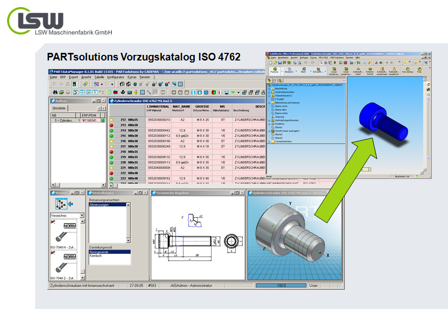 2005/2006 erstellte LSW zusätzlich eigene Werknormen mit Hilfe von eCATALOGsolutions als CAD unabhängiger PARTsolutions Eigenkatalog. In Kombination mit PARTsolutions Professional und der SAP Kopplung ist die LSW Maschinenfabrik GmbH in der Lage, CAD Geometrien bevorzugt einzusetzender Norm- und Kaufteile zu generieren und zentral zu verwalten. Allen Anwendern in den Fachbereichen steht so ein verbindlicher Konstruktionskatalog elektronisch zur Verfügung. Bis dato waren diese Geometrien nur schwer auffindbar und dezentral verfügbar.