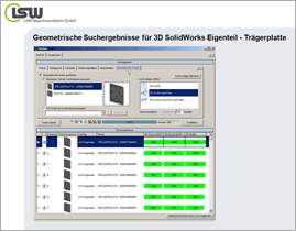 Bei LSW kommt der geometrische Bauteilvergleich für alle 3D Konstruktionseigenteile zum Einsatz, um eine Wiederverwendung bereits konstruierter 3D CAD Bauteile zu gewährleisten. Jährlich werden hiervon ca. 18.000 neu angelegt. Diese mit wenigen Klicks miteinander auf geometrische Ähnlichkeit durchsuchen zu können und auf Wiederverwendbarkeit zu prüfen war das Ziel. Die Ergebnisse werden sekundenschnell aus dem PDM System ausgelesen und als 3D Vorschau zur Auswahl angeboten.