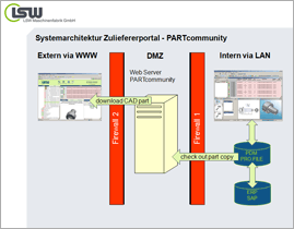 2007 gab LSW das mehrsprachige Webportal, PARTcommunity für die Anbindung externer LSW Konstruktionspartner an die zentrale PARTsolutions Installation frei. Die PARTcommunity Technologie verfügt über eine übersichtliche Navigation und stellt umfangreiche Suchfunktionen zur Verfügung. Dazu muss extern keine Software installiert werden da Teileauswahl ausschließlich via Internet Browser läuft. Die 3D - Vorschaufunktion und der direkte Download der Bauteile aus dem führenden PDM System PRO.FILE ermöglichen dem externen Lieferanten stets aktuellen Zugriff auf die von LSW freigegebenen Norm- und Kaufteile. Da die SolidWorks Modelle bereits durch PARTsolutions Anwender im PDM angelegt wurden, werden sie beim PDM Check-In von Fremdkonstruktionen bei LSW sofort als vorhanden von der PDM Integration erkannt und wiederverwendet. Dabei wird eine neue Stammteilanlage gezielt vermieden.