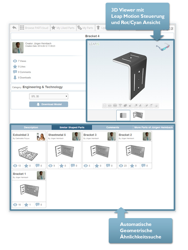 Um die eigenen passenden Bauteile oder die eines Freundes bzw. Arbeitskollegen schnell und einfach aufzufinden, bietet die Rechercheplattform umfassende Suchmethoden, wie die Geometrische Ähnlichkeitssuche oder die Suche anhand einer 2D Skizze. Bauteile können so schnell und einfach anhand ihrer CAD Geometrie aufgefunden und miteinander verglichen werden.