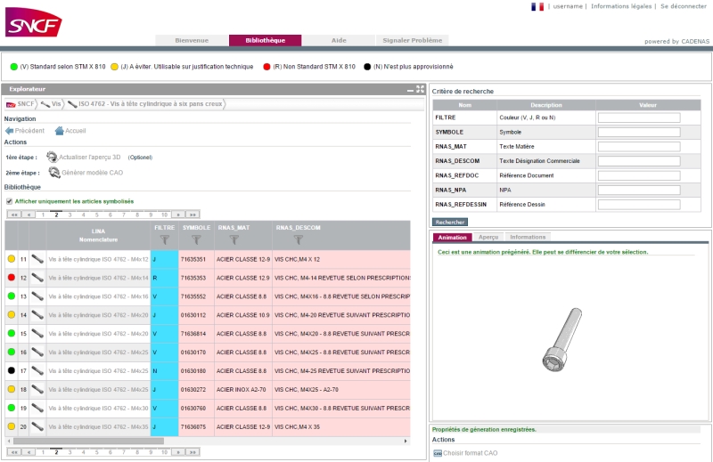 Interne Informationen von SNCF (interne Teilenummern, technische Dokumentationen, Werkstoffe, zugehörige Norm), offizielle Standardinformationen (Beschreibung, Maße, etc.) sowie 3D CAD Modelle. Nach einer erfolgreichen Testphase wurde die neue Informationsplattform im Oktober 2013 erfolgreich für alle Nutzer eingeführt, die mit Rollvorrichtungen arbeiten.