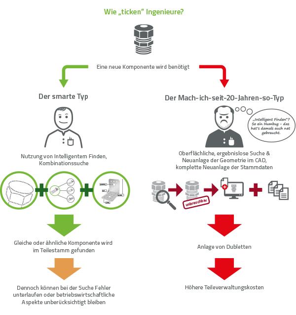 Stehen dem Ingenieur intelligente Suchmethoden zur Verfügung, sind theoretisch die besten Voraussetzungen geschaffen, dass Normteile oder vom Einkauf bevorzugte Kaufteile bei der Konstruktion zum Einsatz kommen. Nur was, wenn der Ingenieur gar nicht oder nur sehr oberflächlich sucht? Die Teile- und Lieferantenvielfalt nimmt zu, es werden Eigenteile entwickelt anstatt am Markt verfügbare Kaufteile zu verwenden und Vorzugslieferanten mit bestehenden Rahmenverträgen bleiben unberücksichtigt.