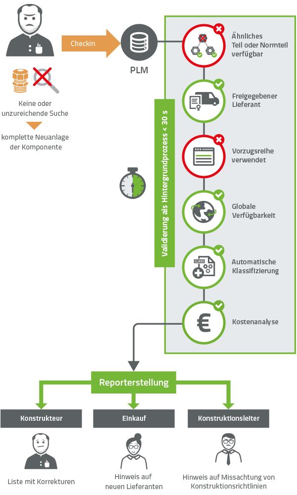 Mit PURCHINEERING 2.0 überwacht ein automatischer Service im Hintergrund sämtliche, ins PLM neu eingecheckte Teile und prüft, ob dieses Bauteil wirklich neu angelegt werden muss. Sollte die Neuanlage unberechtigt gewesen sein, wird über Nacht ein Report generiert und an den betreffenden Ingenieur gesendet.