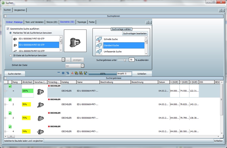 Um den Angebotsprozess noch weiter zu optimieren, wird die OECHSLER AG im Jahr 2016 die 3D Ähnlichkeitssuche des Strategischen Teilemanagements PARTsolutions der CADENAS GmbH einführen. Dieses Tool ermöglicht es, auch unter geometrischen Gesichtspunkten, ähnliche Produkte während der zeitkritischen Anfrage- und Angebotsphase aus dem weitreichenden Datenbestand schnell zu identifizieren.