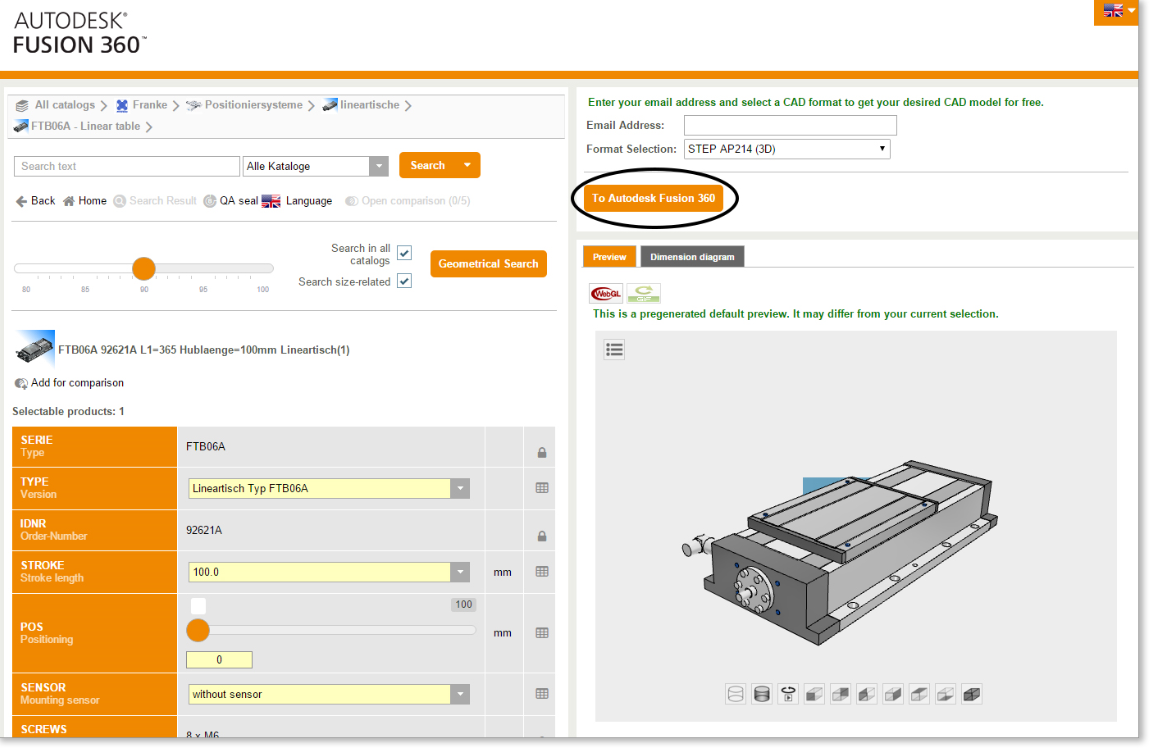 Nach dem Klick auf den Menüpunkt startet im Browser das Autodesk Fusion 360 Portal und benötigte Teile können hier selektiert und konfiguriert werden.