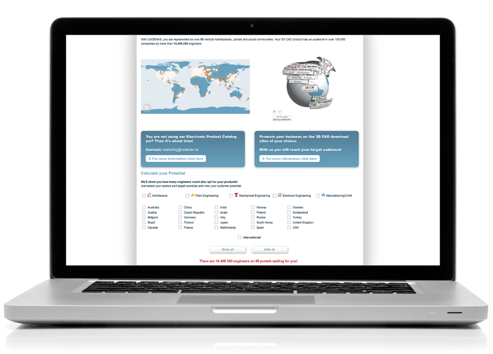 80 vertical online market places, which are constantly expanded, serve as multipliers for the electronic product catalogs. With a potential of more than 14.4 million engineers worldwide, the 3D CAD models of the electronic product catalogs reach exactly the right target group.