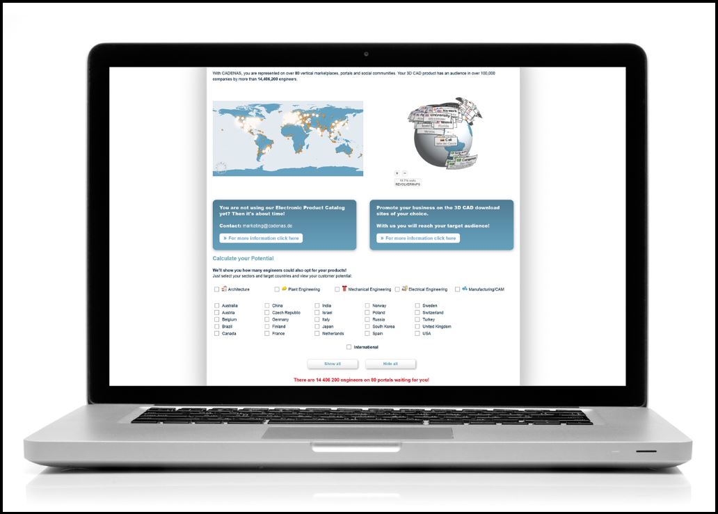 Als Multiplikatoren für die Elektronischen Produktkataloge dienen dabei die 80 vertikalen Online-Marktplätze, die stetig erweitert werden. Mit einem Potenzial von weltweit über 14,4 Millionen Ingenieuren erreichen die 3D CAD Modelle der Elektronischen Produktkataloge von Komponentenherstellern genau die richtige Zielgruppe.