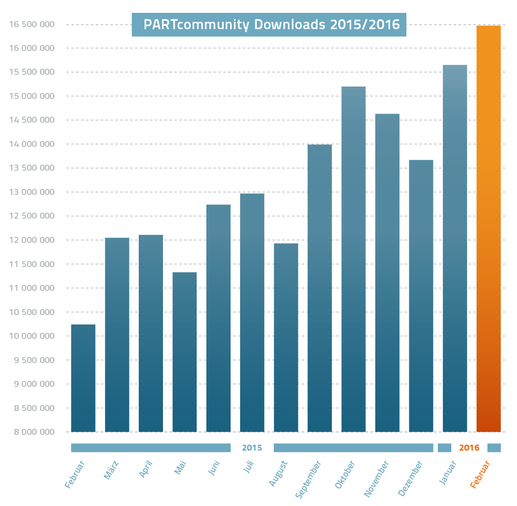 (pressebox) (Augsburg, 05.04.2016) Mit knapp 16,5 Millionen Downloads über das 3D CAD Modelle Downloadportal PARTcommunity im Februar hat niemand gerechnet. Dennoch konnten sich CADENAS und die zahlreichen auf PARTcommunity vertretenen Komponentenhersteller über einen neuen Rekord der monatlichen CAD Modelle Downloads freuen. Zumal in der zweiten März Woche bereits eine weitere Sensation auftrat: Zum 1. Mal wurden mehr als 1 Millionen Downloads an einem einzigen Tag verzeichnet.