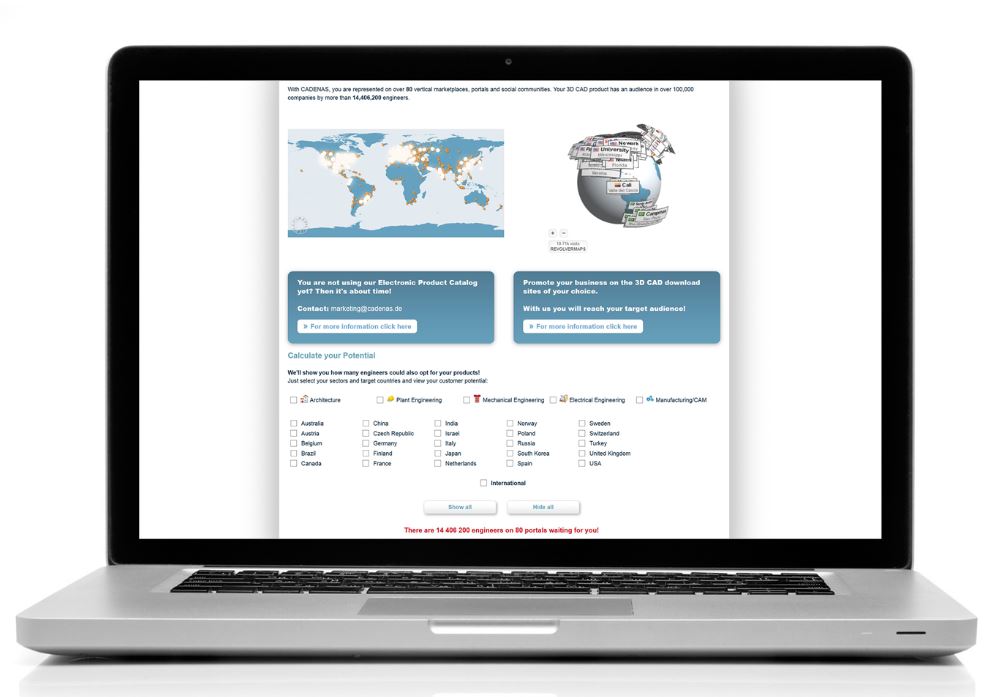 Als Multiplikatoren für die Elektronischen Produktkataloge dienen dabei die 80 vertikalen Online-Marktplätze, die stetig erweitert werden. Mit einem Potenzial von weltweit über 14,4 Millionen Ingenieuren erreichen die 3D CAD Modelle der Elektronischen Produktkataloge von Komponentenherstellern genau die richtige Zielgruppe.