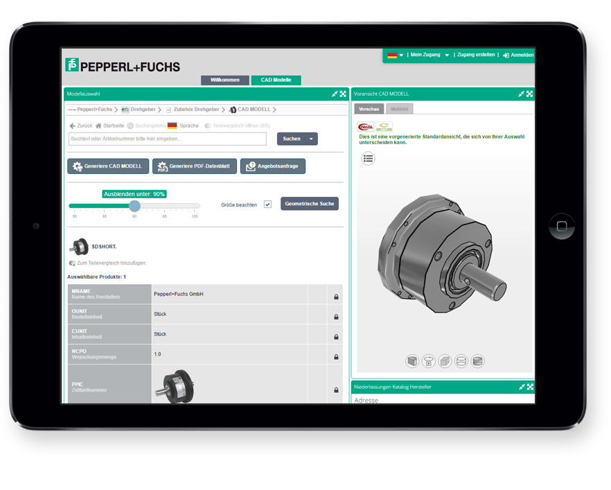 Im Zuge der Digitalisierung, und auf dem Weg zur Industrie 4.0, stellt Pepperl+Fuchs nun seine CAD Daten online bereit. Im Zuge der Digitalisierung, und auf dem Weg zur Industrie 4.0, stellt Pepperl+Fuchs nun seine CAD Daten online bereit. Dabei hatte das Unternehmen spezielle Anforderungen an den Elektronischen Produktkatalog: Zum einen musste die Formatvielfalt von nativen Dateiformaten gewährleistet werden. Viele verschiedene Ausgabeformate für Print, das Internet, Preislisten oder Kataloge sollen aus einer einzigen Datenquellen generiert werden. Zum anderen ist eine exakte und detaillierte Darstellung der CAD Modelle für Kunden notwendig. Ebenso musste eine Vorschau des Produktes und das direkte Einbinden ins jeweilige CAD Programm möglich sein. Außerdem war es Pepperl+Fuchs wichtig, ein zentrales Produktportal anbieten zu können.