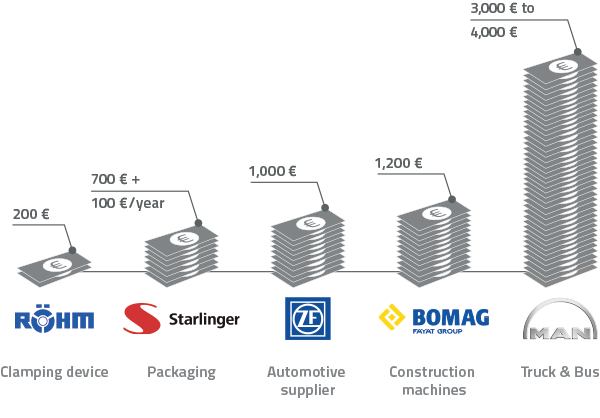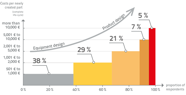 The biggest part of the respondents, that is to say 88 %, think that costs between 501 € and 5,000 € per part occur. 5 % of the respondents even assume that costs of more than 10,000 € could arise per component. However, the amount of costs per part depends on whether companies are involved in equipment or production design.