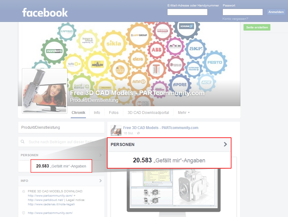 (pressebox) (Augsburg, 23.06.2016) Mit CADENAS profitieren auch Sie als Komponentenhersteller vom großen Erfolg des sozialen Netzwerks Facebook. Die Facebook-Seite des 3D CAD Modelle Downloadportals PARTcommunity erfreut sich immer größerer Beliebtheit. Schon mehr als 20 000 Fans folgen den neuesten Trends und Neuigkeiten rund um das Thema 3D CAD Modelle und deren Download. Und das Beste: Alle CADENAS Kunden, die einen Elektronischen Produktkatalog der eCATALOGsolutions Technologie veröffentlicht haben, profitieren ganz automatisch von der erfolgreichen Präsenz auf Facebook und ziehen die Aufmerksamkeit von mehr als 20 000 Facebook Nutzern auf ihren Produktkatalog.