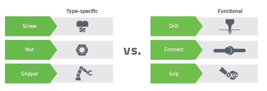 When introducing classification system manufacturers can be classify functionally (connecting, milling, drilling ...) or type-specifically (screw, nut ...).