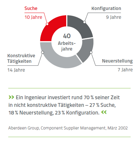Eine nicht unwesentliche Zeit geht für die Suche nach Normteilen verloren. Ein mittleres Kunststoffspritzgießwerkzeug besteht aus ca. 150 Einzelteilen. Der Anteil an Normteilen beträgt ca. 20 %. Bei einer Anlage der Automatisierungstechnik sprechen wir von ca. 500 Einzelteilen. Der Anteil an Normteilen ist somit wesentlich höher.