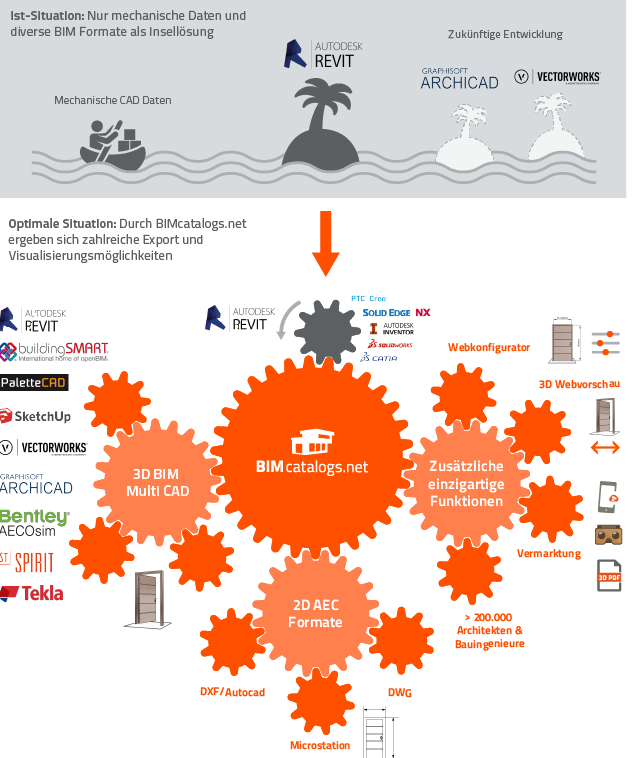 Darüber hinaus werden die CAD Produktdaten zusätzlich auf der Plattform BIMcatalogs.net von CADENAS veröffentlicht. BIMcatalogs.net bietet Komponentenherstellern ideale Vermarktungsmöglichkeiten: Die BIM Daten sind auf über 80 vertikalen Marktplätzen, Portalen und Social Communities vertreten. Des Weiteren hat ein 3D BIM CAD Produktkatalog das Potenzial in über 100 000 Unternehmen von mehr als 15 000 000 Architekten, Bauingenieuren, TGA-Spezialisten, Maschinenbauingenieuren, Anlagenbauern und Elektrotechnikern genutzt zu werden.