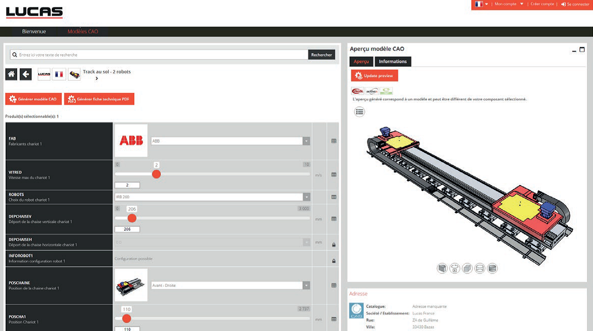 mit der der Bodentrack im Internet konfiguriert, Angebote erstellt und die passenden 3D CAD Modelle bereitgestellt werden können, ohne dass der Bearbeiter bei jeder Modifikation auf Informationen des ERP Systems angewiesen ist. „Auch wenn der Produktkonfigurator von CADENAS im Hintergrund komplex aufgebaut ist, ist die Nutzung für unsere Kunden und unseren Vertrieb extrem einfach. Für die Schulung unserer Mitarbeiter wird weniger als ein Arbeitstag benötigt“, so Stéphane LUCAS, Projektingenieur bei LUCAS FRANCE.