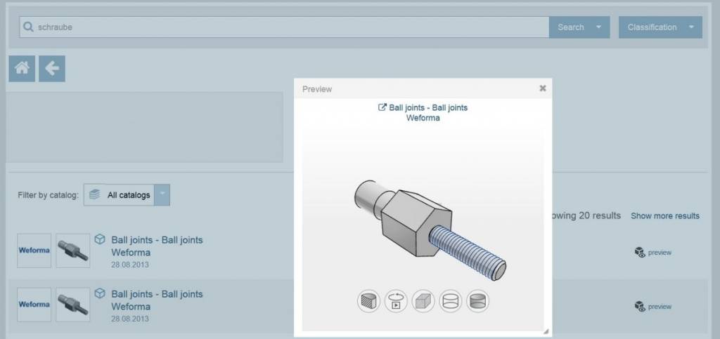 Ingenieure bekommen während der Suche nach einem geeigneten CAD Modell automatisch eine Auswahl an geometisch ähnlichen Teilen vorgeschlagen. Zur besseren Beurteilung der Herstellerkomponenten, können diese nach dem Anklicken in einem neuen Fenster angezeigt werden. Mit dem Mauszeiger wird dann das CAD Modell bewegt und von allen Seiten betrachtet.