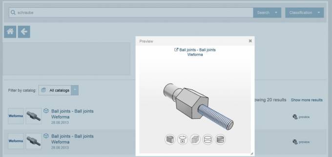During the search for a suitable CAD model, engineers automatically receive a suggested selection of geometrically similar parts. In order to better assess manufacturer components, they appear in a new window after being clicked on. The CAD model can then be moved and viewed from all sides with the cursor.