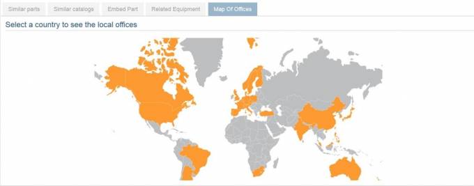 When selecting suitable engineering data, users can display the subsidiaries and the manufacturer representatives to make faster direct contact. Clicking the country on the map causes the corresponding address to appear. The country of the subsidiary in the address area can be changed via the drop down menu.