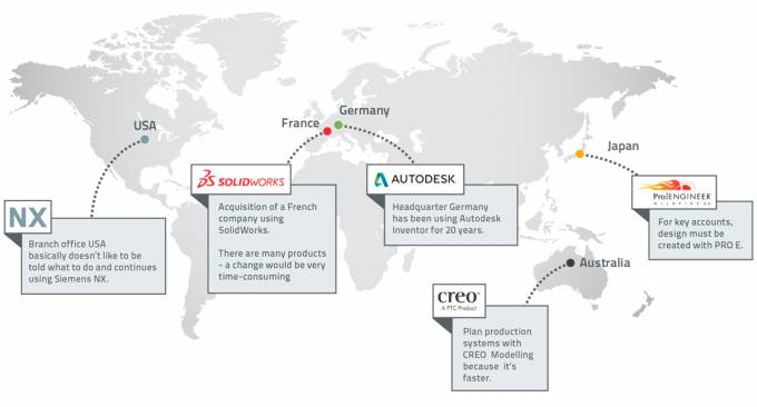 Such a Multi CAD system environment involves problems for the user as well as the company. Despite the multitude of different CAD systems global development teams are supposed to develop a product from a single source. Every CAD location has its own CAD specific data pool, data can not be exchanged with other locations or systems, causing unnecessary additional effort when maintaining data. Furthermore, several autonomous CAD data pools result in redundant parts creation and parts being procured several times in different ways which leads to higher procurement and storage costs.