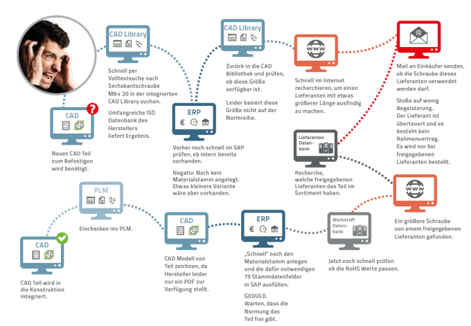 Die Entscheidung für die bestmögliche Komponente lässt sich nur dann treffen, wenn alle relevanten Informationen zur Verfügung stehen. Ohne das Strategische Teilemanagement von CADENAS müssen Ingenieure und Einkäufer zwischen den einzelnen Systemen hin und her springen, was nicht nur Zeit, sondern auch Geld kostet. Ein konzentriertes Arbeiten am Projekt ist so nicht möglich.