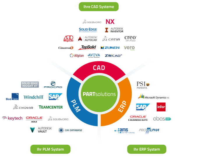 CADENAS integriert das Strategische Teilemanagement PARTsolutions nahtlos in bestehende PLM-, CAD- und ERP Systeme. Dadurch wird ein optimales Zusammenspiel aller Systeme ermöglicht. PARTsolutions bietet Schnittstellen und Integrationsmöglichkeiten für folgende PLM- und PDM Systeme: