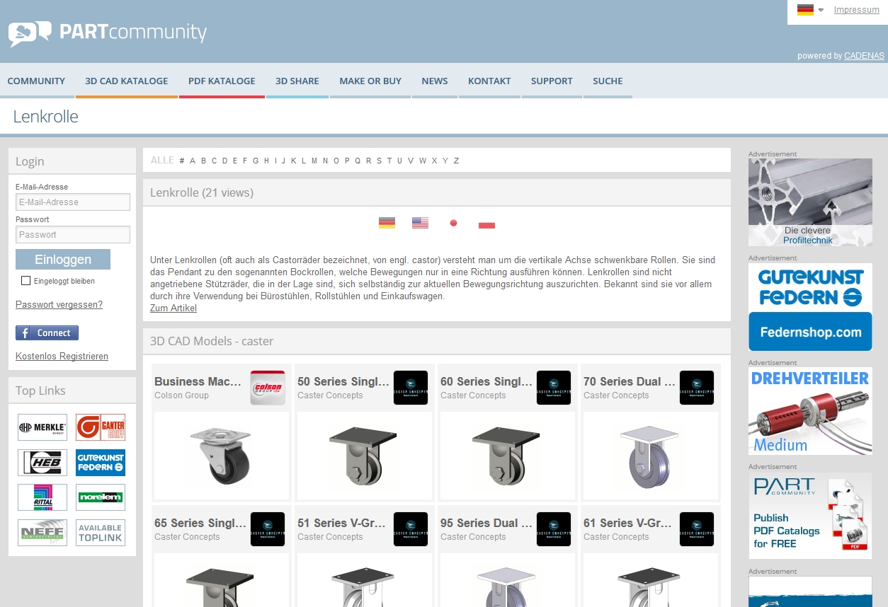 Das 3D CAD Modelle Downloadportal PARTcommunity gehört zum täglichen Werkzeug von Millionen Ingenieuren weltweit, was die jährlichen Downloadzahlen beweisen: Im Jahr 2016 wurden insgesamt 212 Millionen Downloads von 3D Engineering Daten getätigt. Ingenieure und Einkäufer können weltweit, rund um die Uhr 3D CAD Daten in über 100 nativen Formaten, wie z. B. Autodesk, Revit, Solid Edge, SolidWorks, NX etc. herunterladen und sie in ihr jeweiliges CAD System importieren. Ihnen steht dafür der gesamte Inhalt von über 460 namhaften und herstellerzertifizierten Elektronischen Produktkatalogen von Unternehmen, wie WAGO, Würth und Festo kostenlos zur Verfügung.