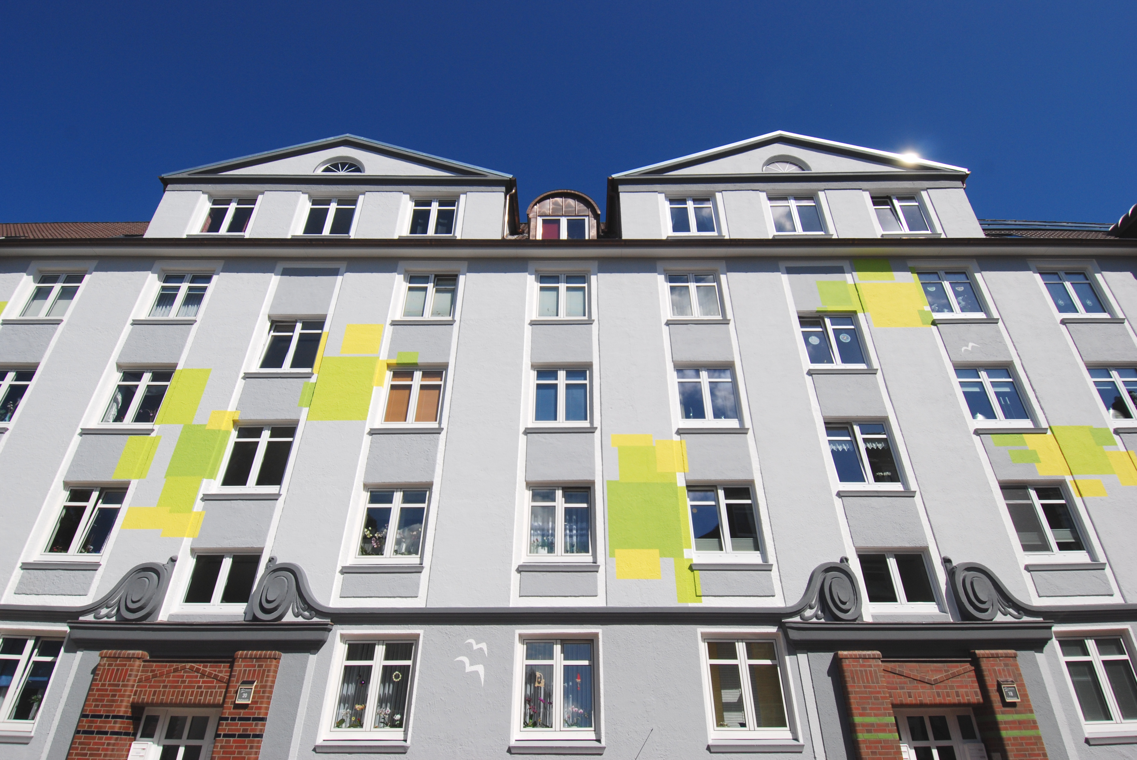 Ein echtes Highlight befindet sich an der Giebelseite mit der zwölf Meter hohen und fast sechs Meter breiten fotorealistischen Darstellung eines Kastanienbaums. Damit wollte Jürgen Garms den Mietern des Nachbarhauses, das quer dazu steht, einen »Blick ins Grüne« vermitteln - wenn schon kein Platz für einen echten Baum da ist. Er fand das Motiv nach langer Internetrecherche in einer Bilddatenbank und ließ es dann von einer Werbeagentur überarbeiten. "Die Farben haben zufällig genau zum Caparol-Farbkonzept gepasst", freut er sich. Der Kastanienbaum, der wie von Künstlerhand auf die Fassade gemalt wirkt, ist ein Fotodruck auf einem Spezialgewebe, auf das sich Bildmotive jeder Art und in fast jeder Größe applizieren lassen. "Mit Capatect PhotoVision kann der Handwerker praktisch jedes Foto, jede Grafik, jedes Kunstwerk oder Ornament auf glatt gespachtelte Außen- oder Innenwände übertragen. Der fertige Motivträger wird zum Wunschtermin in Rollenform geliefert. Die handwerkliche Applikation geht dann am Objekt so einfach von der Hand wie das Kleben von Tapeten", erläutert Oliver Berg, Fassadenspezialist bei Caparol in Ober-Ramstadt. Einzige Voraussetzung: Die Wand muss möglichst glatt geschliffen sein, damit das spätere Fassadenbild nicht ungewollt verzerrt erscheint. Das Gewebe mit dem Motiv wird mit einem Spezialkleber Bahn für Bahn, Stoß an Stoß, im Kleberbett auf die Trägerfläche aufgebracht. Nach der Trocknung (frühestens jedoch nach 24 h) kann mit Caparol TopLasur NQG eine zusätzliche Schutzbeschichtung aufgetragen werden.