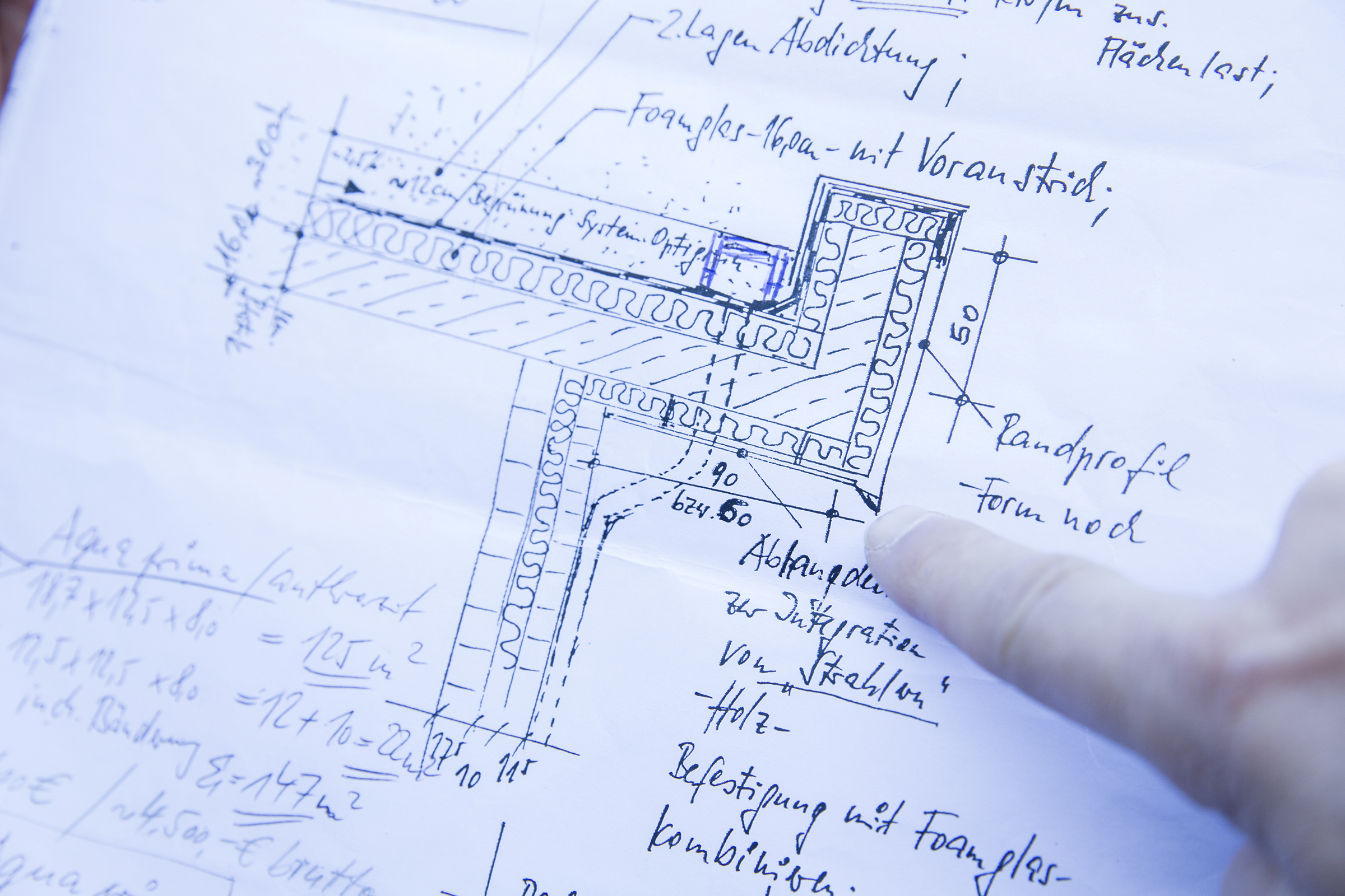 Gemeinsam mit dem Neusser Malermeister Thomas Welter wurde nach einer passenden Lösung gesucht. „Eine großflächige Verblendung der Attika mit Metallblech oder Schiefer kam nicht in Frage“, erinnert sich Unsel. Das wäre bei einer Gesamtlänge der Attika von 56 Metern und einer Höhe von 80 Zentimetern sowohl sehr kostspielig als auch gestalterisch nicht im Sinne des Bauherrn gewesen. Deshalb ging man einen anderen Weg, bei dem eine Tropfkante ausgebildet werden konnte und zugleich ein kreativer Verputz der Flächen mit individuell gestalteten Oberflächentexturen möglich war.
