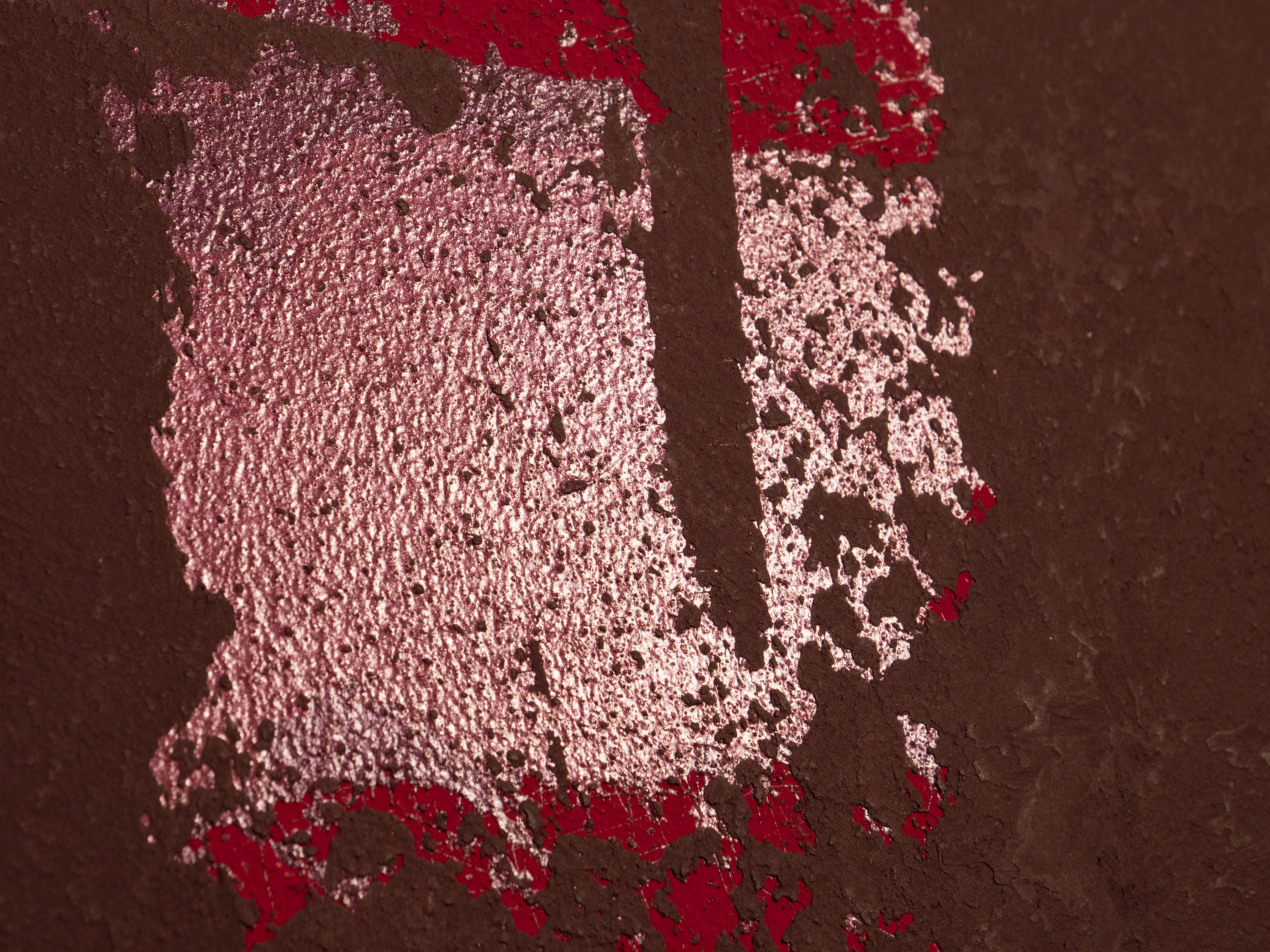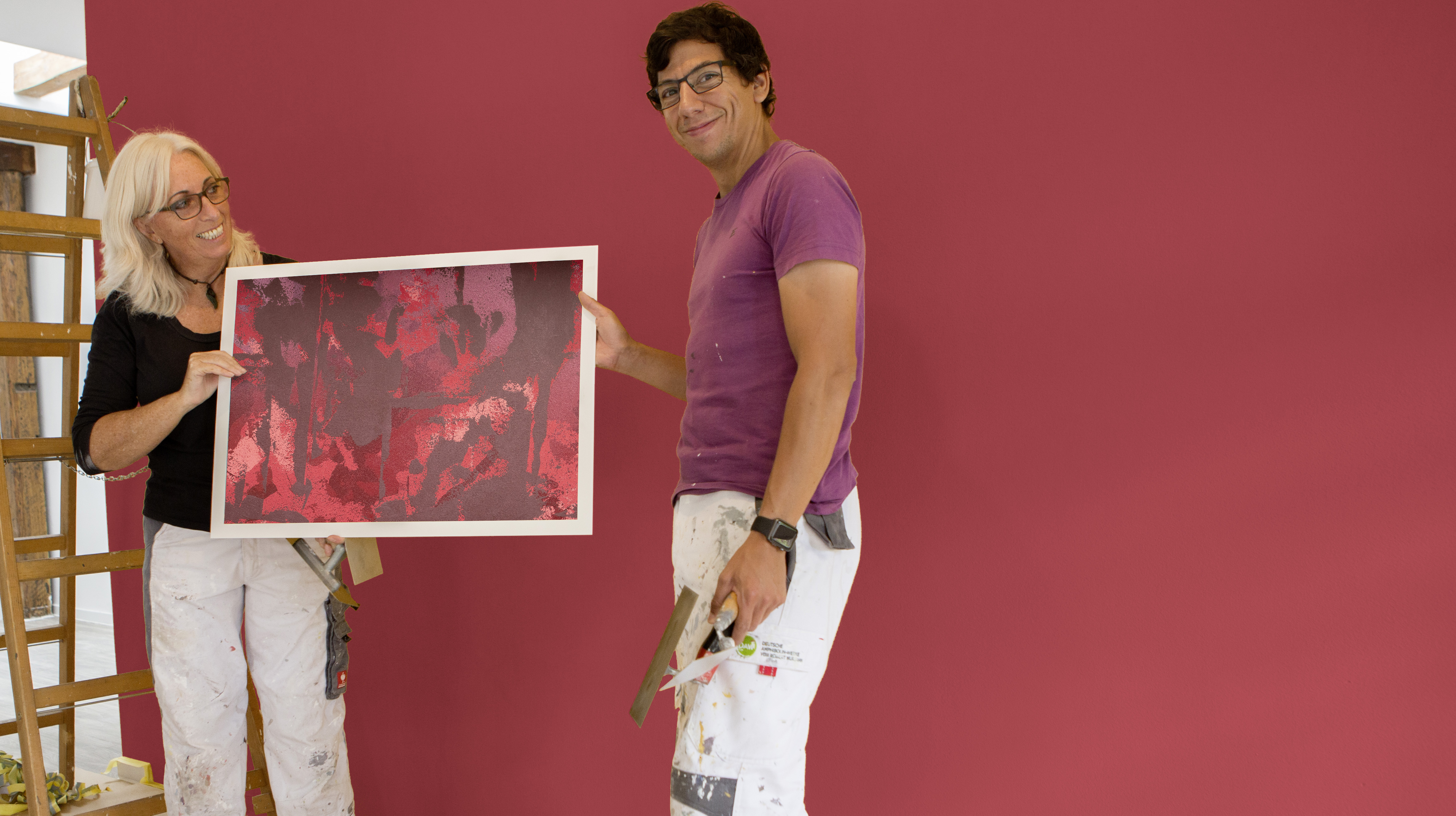 Hierzu Sabine Hoffner: „Bei der „Ethno-Technik“ verlassen wir den Standard einer klassischen Applikation, experimentieren mit Produktkombinationen. Und zwar mit Produkten, die sich bereits im Caparol-Portfolio befinden und sich durch ihre Qualität bewährt haben.“ Hierzu wurde die Wandfläche in einer brillanten Rotnuance deckend vorgerollt. Mehrere sich partiell überlagernde Fleckspachtelungen (Venezianer Kelle) in matt und metallisch sorgen für eine optische Tiefe. Strukturgebend und damit maßgeblich für die Anmutung der Wand ist der abschließende Spachtelauftrag. Der dunkelste Farbton gibt der Oberfläche ihren spezifischen Charakter. „Bei dieser Ausführung sind es angedeutete vertikale und horizontale Streifenapplikationen, die sich an manchen Stellen bis hin zu geschlossenen Flächen verdichten können. ‚Ausbrecher‘ in die Diagonale bereichern das Bild“, erläutert Sabine Hoffner, die die Technik gemeinsam mit Maler- und Lackierermeister Patrick Lamola, der auch staatlich geprüfter Gestalter ist, auf die Wand gebracht hat. „Der prüfende Blick mit einem gewissen Abstand ist unerlässlich und sollte ständig erfolgen“, weiß die Malermeisterin, die zum Team des Caparol FarbDesignStudios gehört und bereits zahlreiche Kreativtechniken erschaffen hat. Mit einem finalen Spachtelauftrag lassen sich Assoziationen zur Wandgestaltung steuern. Von einer antiken Archaik, über Graffiti beispielsweise in Form von Buchstabenfragmenten, bis hin zu bekannten klassischen Ethno-Mustern und Prints sind Interpretationen kaum Grenzen gesetzt.