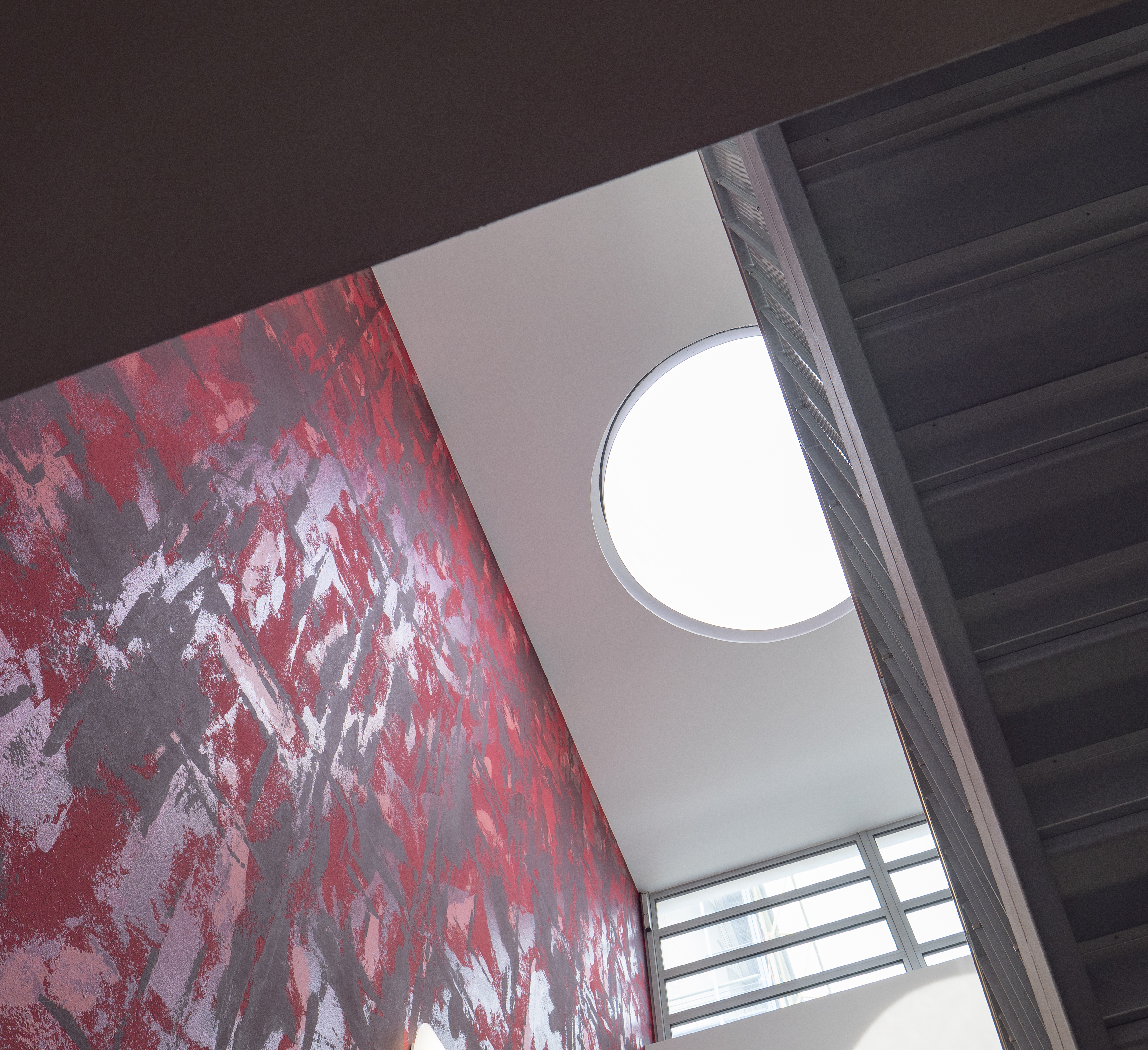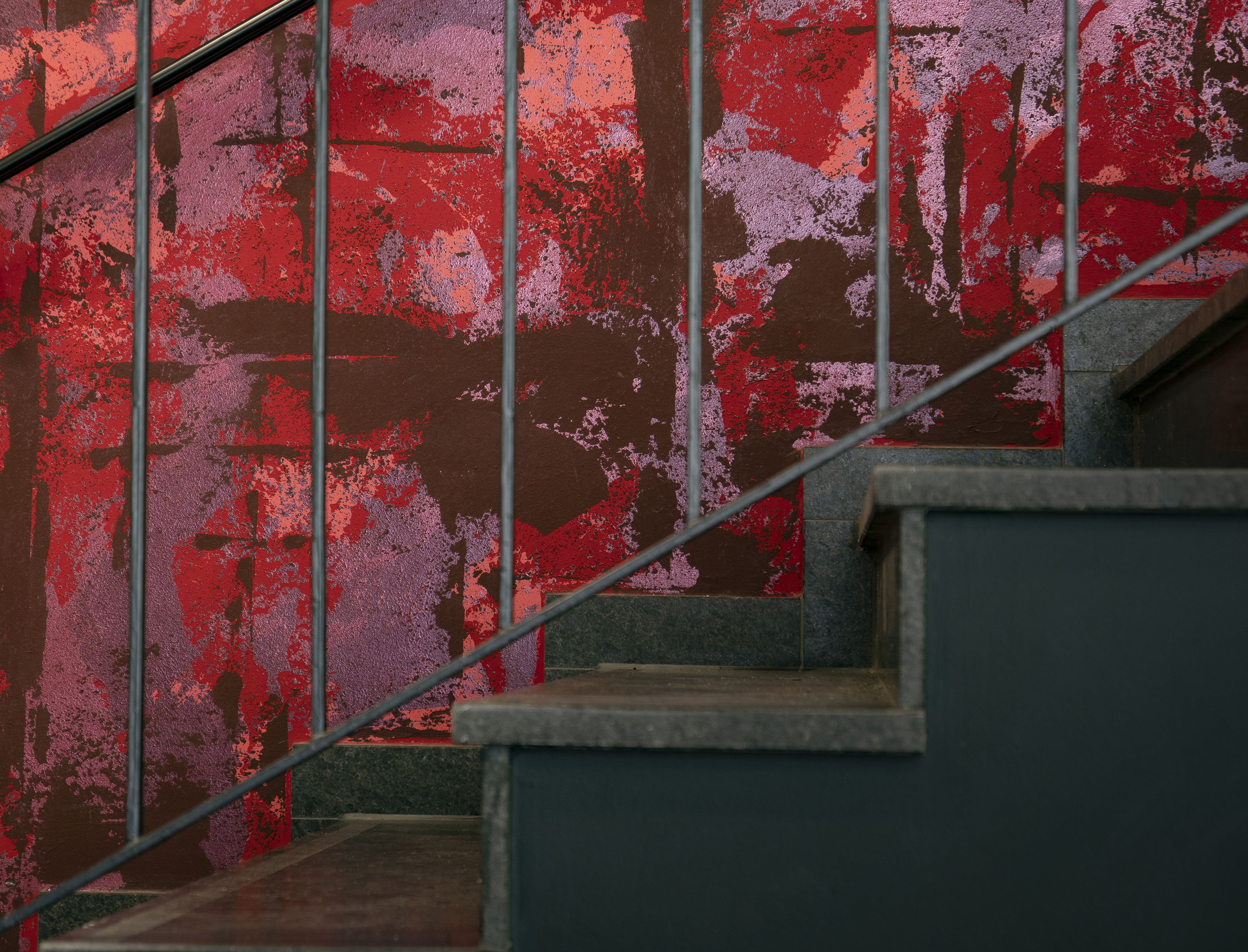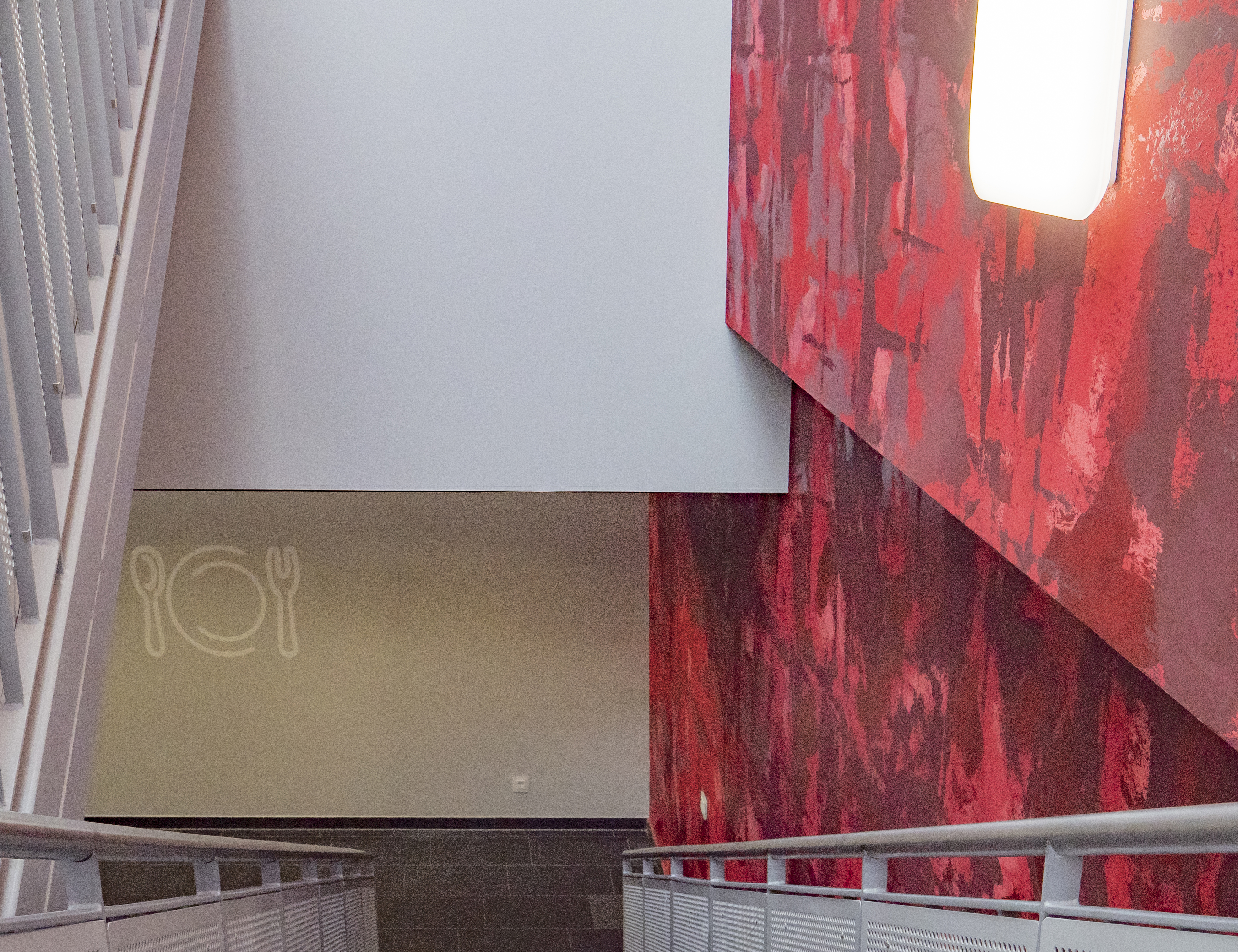 Verschiedene Rotnuancen, zwei unterschiedliche Metallocryl-Farbtöne (Baccara 10 MET / Extraordinary 10 MET) und ein dunkler Rotton prägen die auffällige Wandgestaltung. Die Treppe setzt sich dunkel und skulptural von der Wand ab. Untersichten und Wangen sind schwarz gestrichen. Durch den ebenfalls dunklen Fliesenbelag erscheinen die Treppenläufe wie aus einem Guss. Die übrigen Wände nehmen sich bewusst zurück, um nicht mit der Akzentwand zu konkurrieren. Ein Tischgedeck als Schablone gibt einen dezenten Hinweis, wohin die Treppe führt. Die Farben des Treppenhauses stehen in Verbindung zur Kantinenfarbigkeit. Der zurückhaltende, warme Grundfarbton (3D Palazzo 20) und eine Rotnuance (3D Venezia 5) aus der Ethno-Oberfläche finden sich in der Kantine wieder. Das Rot hat im Treppenhaus somit auch eine leitende und vorbereitende Funktion.
