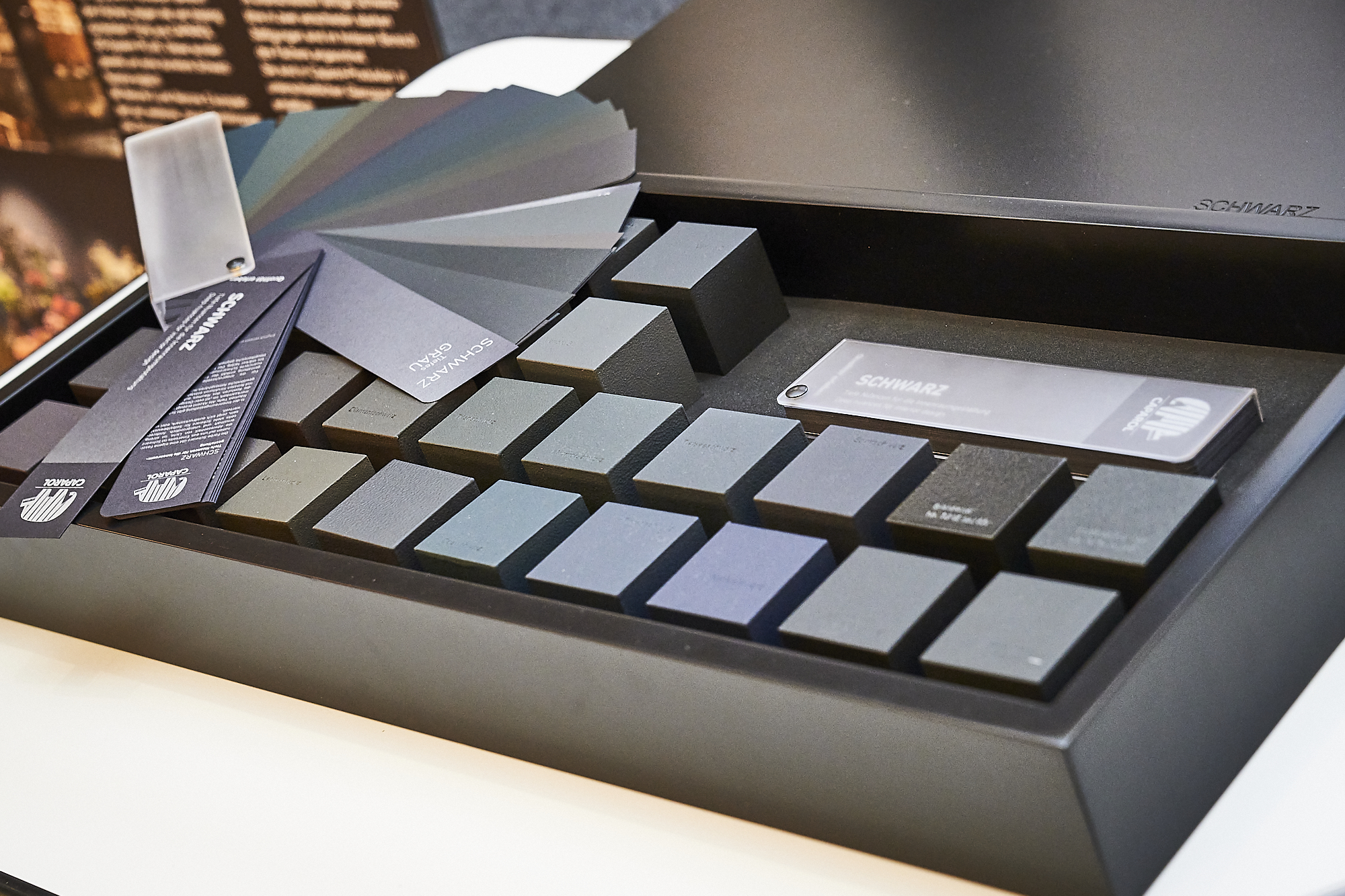 Hintergrund bei der Entwicklung des Schwarzfächers ist der Trend zu dunklen Farbnuancen in der Innenraumgestaltung. Schwarz gibt Räumen Tiefe. Es erzeugt Aufmerksamkeit und im „all over-Design“ löst es die Konturen des Raumes auf. Gepaart mit feinsten Strukturen entstehen außergewöhnliche Atmosphären. Für Gestalter übt die Farbe Schwarz eine eigene Faszination aus – nun haben sie die Wahl aus 26 fein-nuancierten tiefen Schwarztönen. Vier der Graufamilien aus dem 3D-System PLUS Farbtonblock wurden dafür je um einen dunkleren Ton ergänzt. Eine weitere Graureihe wurde neu entwickelt und zeigt sich mit „Nerone 0“ und „Nerone 5“ im neuen Fächer. Hinzu kamen „unsere 16 Schätze“ – so nennt Farbdesignerin und Dipl.-Ing. Architektur Carmen Rubinacci die Variationen von farbigem Schwarz. Das sind Nuancen mit einem gerade noch wahrnehmbaren Hauch von Rot, Blau, Gelb oder Grün. Mit dem bloßen Auge isoliert betrachtet sind diese Feinheiten kaum zu erkennen. Doch wenn die gesandelten Streifen des Schwarzfächers auf einem dunklen Untergrund nebeneinander liegen, lassen sich die fein voneinander differenzierten Farbtöne gut unterscheiden. Die neuen Farbtöne sind hervorragend geeignet für Objekte wie Büro, Gastronomie über Hotel bis zur Gestaltung ausgewählter Wohnbereiche.