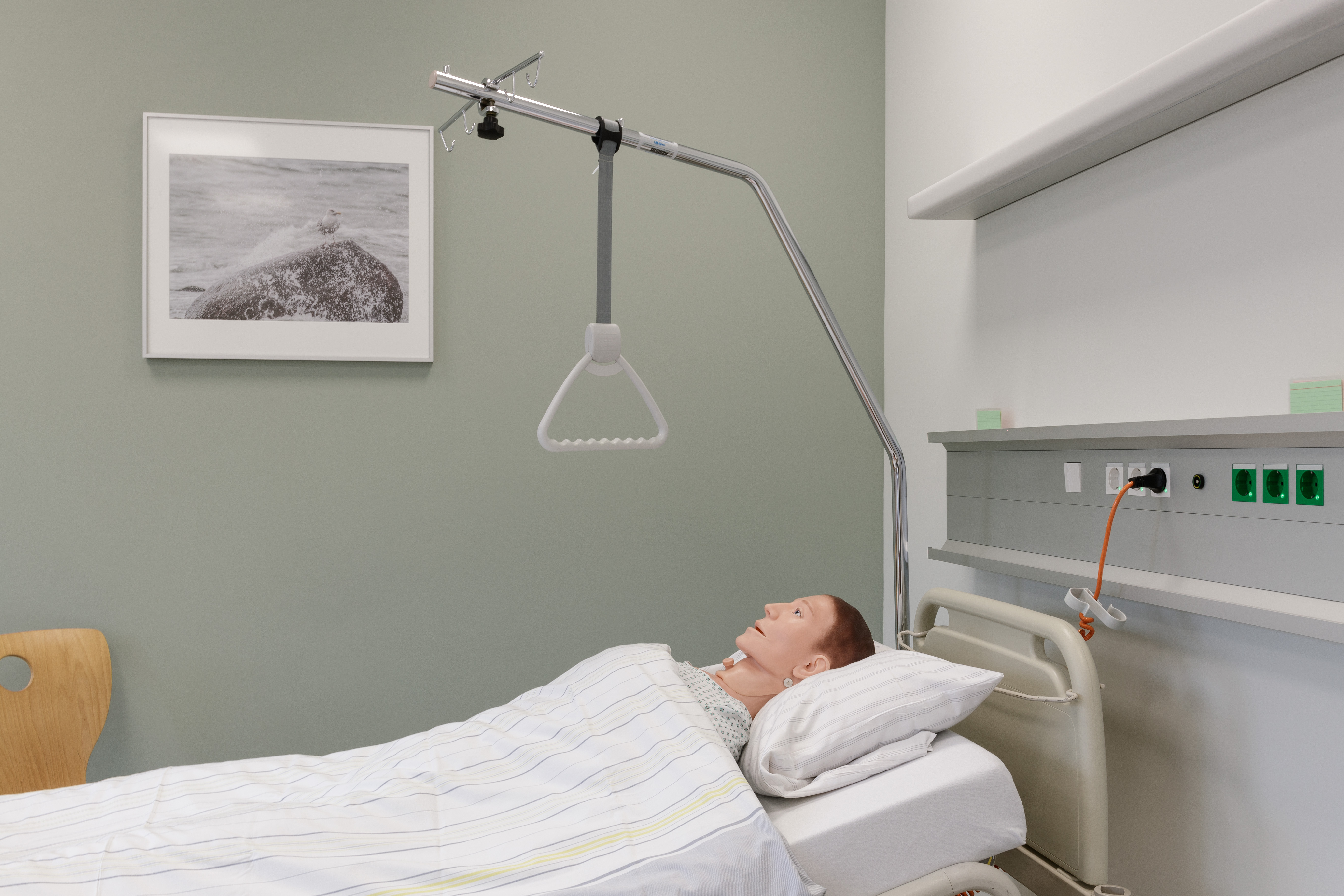 Das beginnt im Erdgeschoss bei den Übungsräumen, die den Patientenzimmern einer Klinik nachempfunden sind. Hier ist alles so realistisch wie möglich gestaltet, um für die Schüler eine optimale Übungssituation zu schaffen – manchmal liegen sogar Schauspieler in den Betten. Also wurden Ansätze aus dem Farbkonzept "Lebensräume" übernommen, nach dem Motto: natürliche Farbstimmungen von draußen nach drinnen holen und so das Wohlbefinden des Patienten steigern. Verschiedene Grüntöne sowie ein Boden in Holzoptik prägen das Ambiente und ein zartes helles Grün wurde als Basiston für die Wände festgelegt.