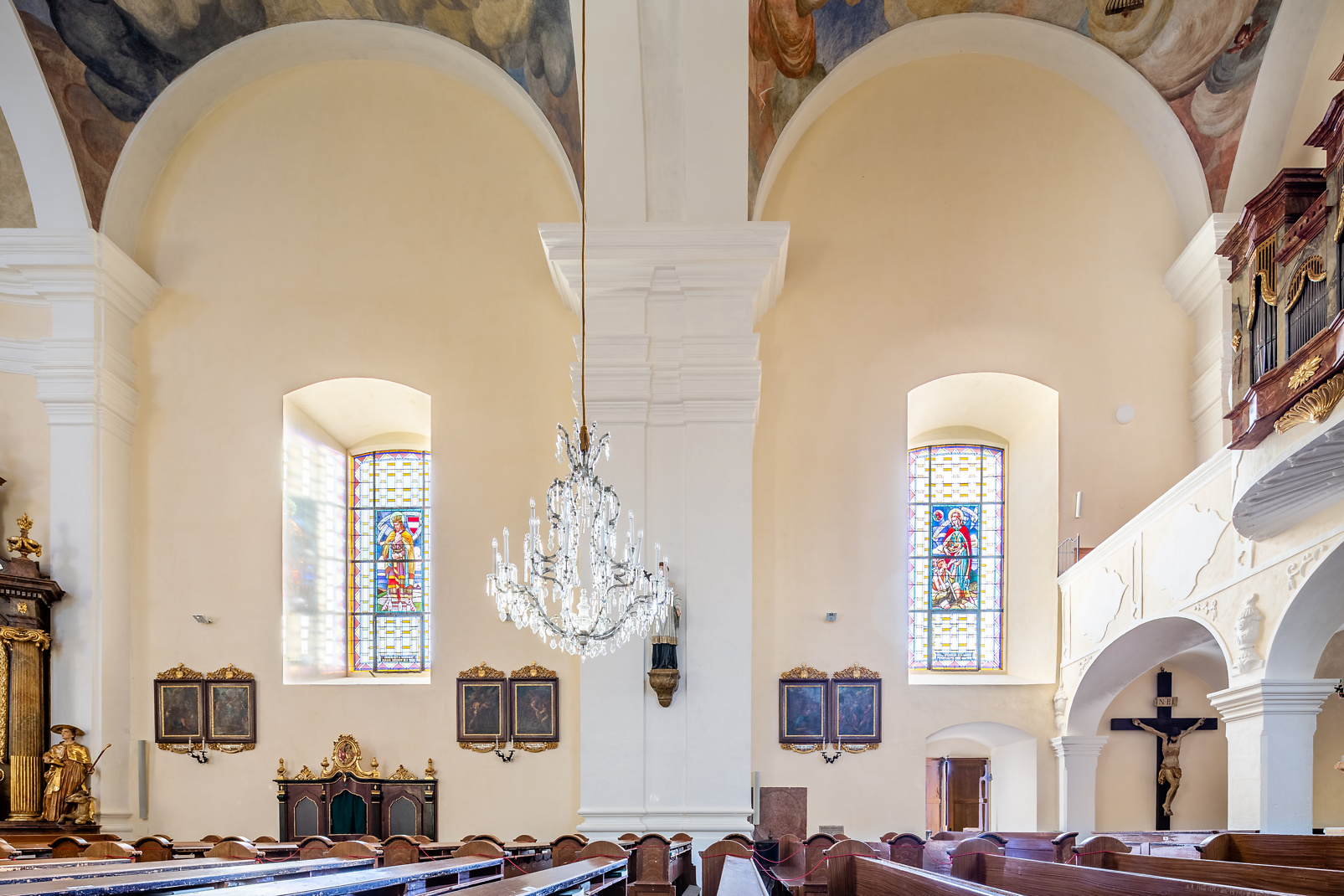 Den Malerarbeiten ging eine vollflächige Reinigung der verschmutzten Wände voraus. Dazu kam eine Hochdruckhaube zum Einsatz. In der Folge wurden die Löcher und schadhaften Stellen mit einer Kalkspachtel (Histolith Brillant Kalkspachtel) ausgebessert. „Rund 1200 m2 erhielten den neuen Anstrich. An stressigen Tagen waren 10 meine Mitarbeiter im Kircheninneren am Werk", sagt Petra Hofbauer. Da der mineralische Altanstrich sehr viel Flüssigkeit aufsog, wurde gleich viermal gestrichen. Vier Monate nach Start der Arbeiten konnte die Kirche im Oktober 2020 mit einem Festgottesdienst wieder ihrer Bestimmung übergeben werden.
