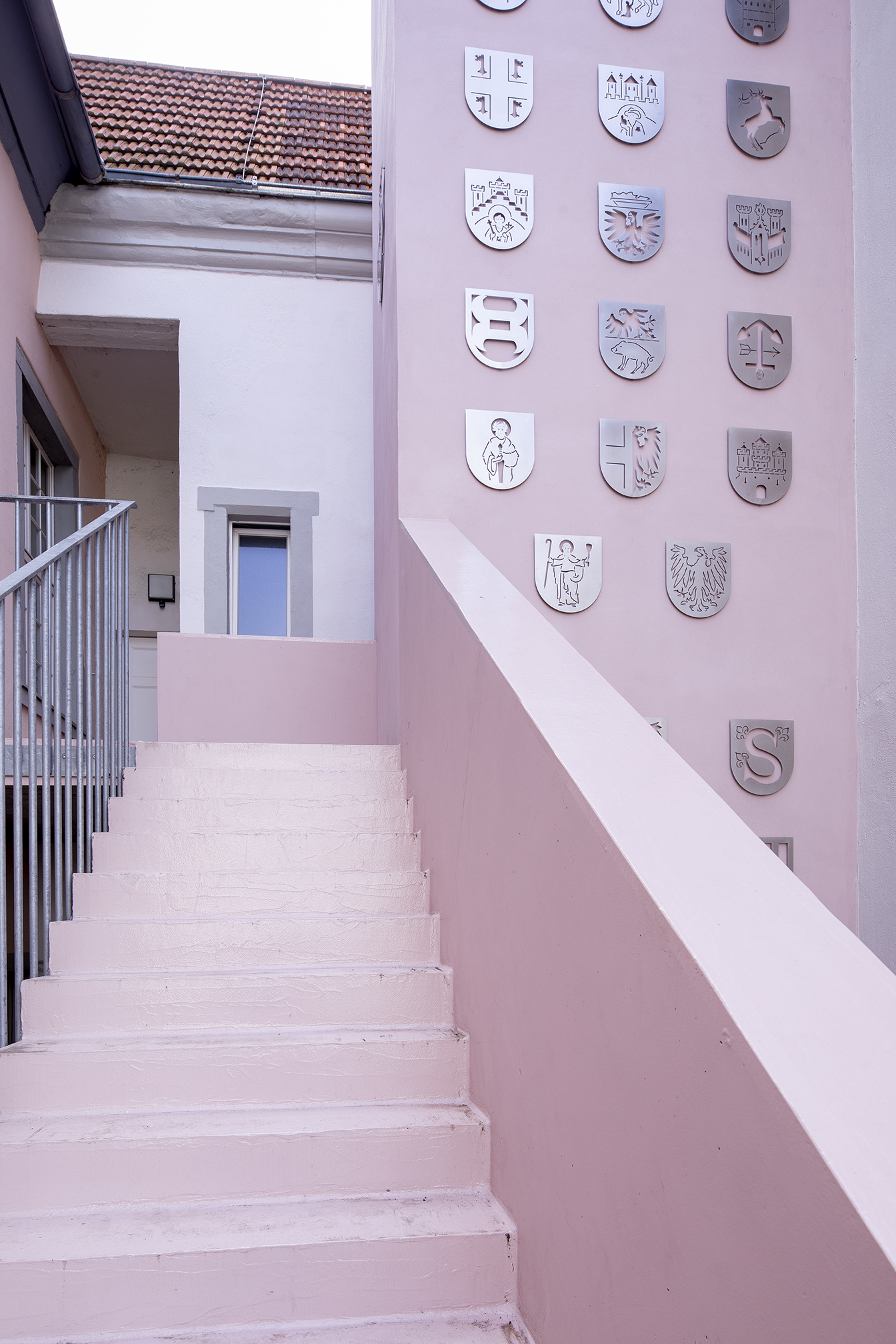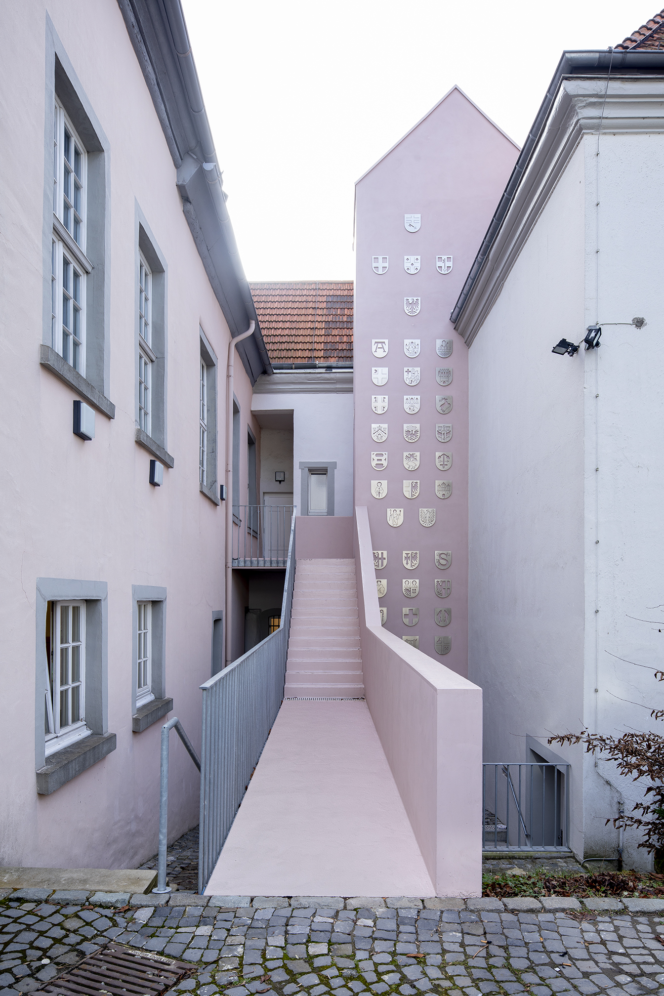 Entscheidend für das harmonische Gesamtbild von Bestand und Neubauten war allerdings vor allem die Farbangleichung. Der Original-Farbton des Alten Rathauses, ein helles Rosa, wurde durchgängig auf Turm und Treppe übertragen, wodurch trotz unterschiedlicher Oberflächen der Eindruck eines Ensembles aus einem Guss entsteht: „Eine besonders spannende Aufgabe, die schön umgesetzt wurde“, findet Bernd Hauröder, Regionaler Großkundenbetreuer beim Baufarbenhersteller Caparol, der den Architekten bei der Materialauswahl für die Rathaus-Anbauten beraten hat.