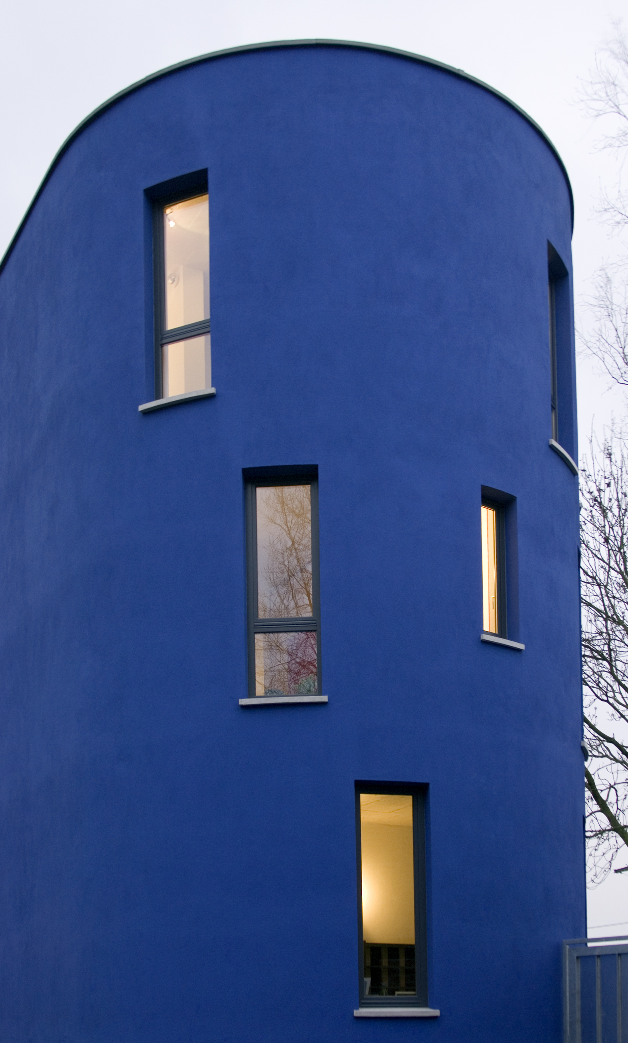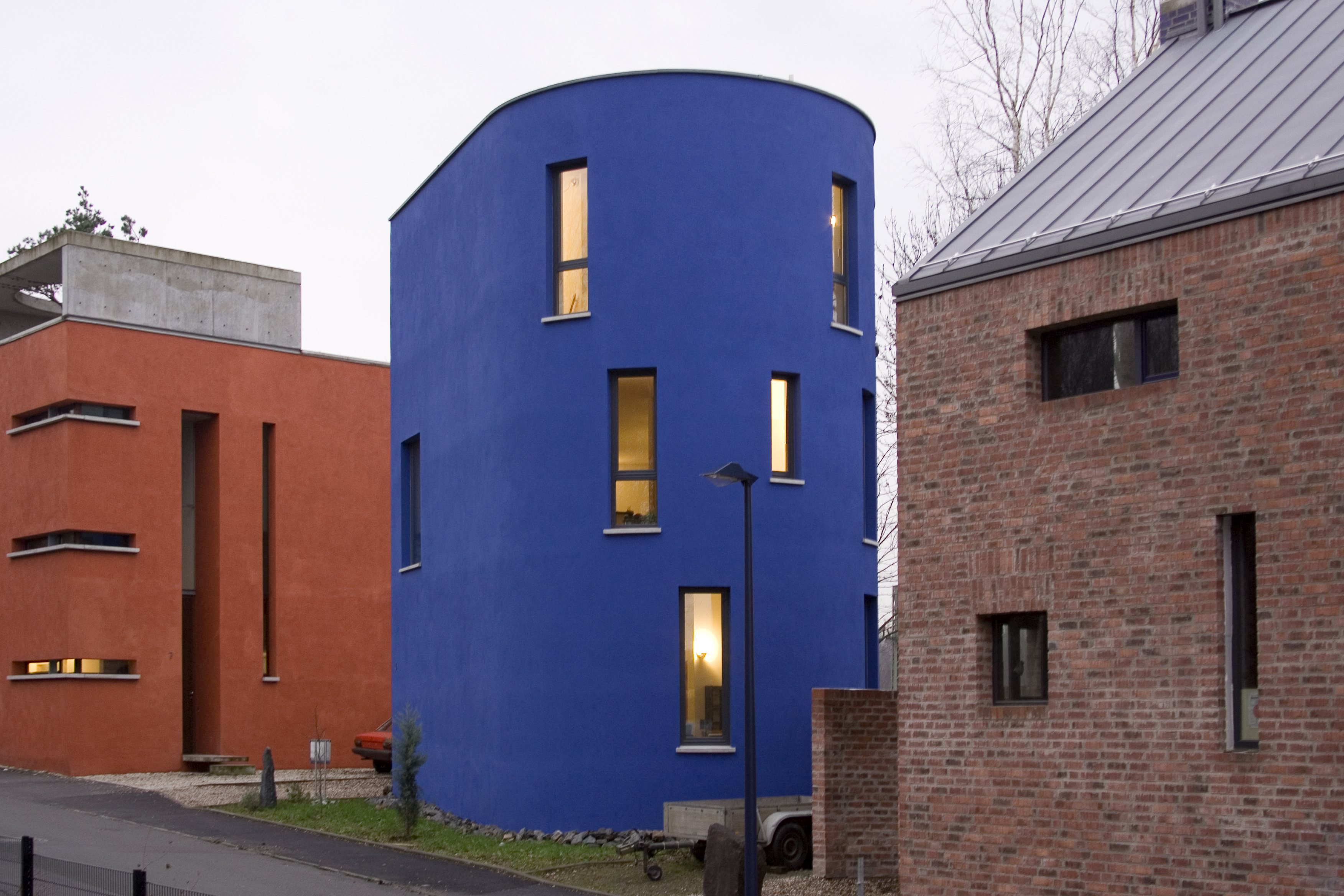 Den Auftrag für den Außenanstrich erhielt ein professioneller Verarbeiter. So sorgten Frank Stachowiak und seine Kollegen aus Bochum für ein makelloses Erscheinungsbild: "Wir waren zu Dritt mit den Putzarbeiten beschäftigt. Die Farbe haben wir mit breiten Lammfellrollen auf den gut durchgetrockneten Putz aufgetragen. Den kobaltblauen Farbton gab es nur von Caparol. Das Ergebnis hat mich in seiner Schönheit selbst überrascht", erinnert sich Stachowiak an die Ausführung. Und auch die Nachbarschaft im Leierweg zeigt sich von der eigenwilligen Farb- und Formgebung begeistert.
