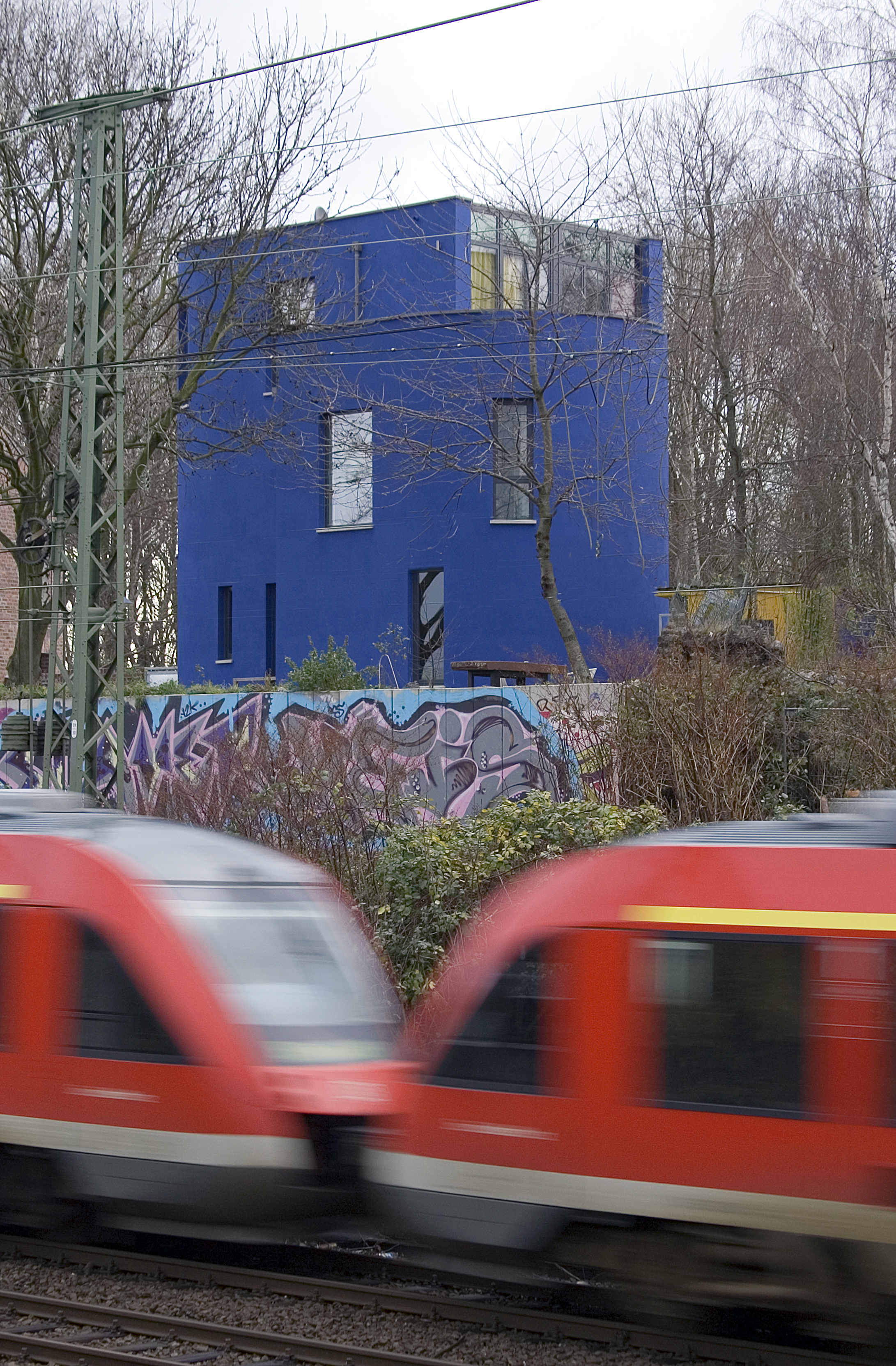 Den Außenanstrich trägt ein fünf Zentimeter dicker Wärmedämmputz auf 36,5er Mauerwerk aus Bimssteinen und Hochlochziegeln. "Geringer Energiebedarf ist durch diese Bauweise garantiert", weiß Stadtplaner Harry Lausch, der das Bauvorhaben von Anfang an begleitete. "Besondere Aufmerksamkeit verdient in dieser Lage auch der Schallschutz", so Lausch. Denn auf der mehrspurigen Bahntrasse hinterm Haus geben sich S-Bahnen und hin und wieder sogar ICE ein Stelldichein. Blickt man aus Cornelia Suhans Wohnzimmerfenster, scheint es, als säße man den Bahnreisenden vis à vis.