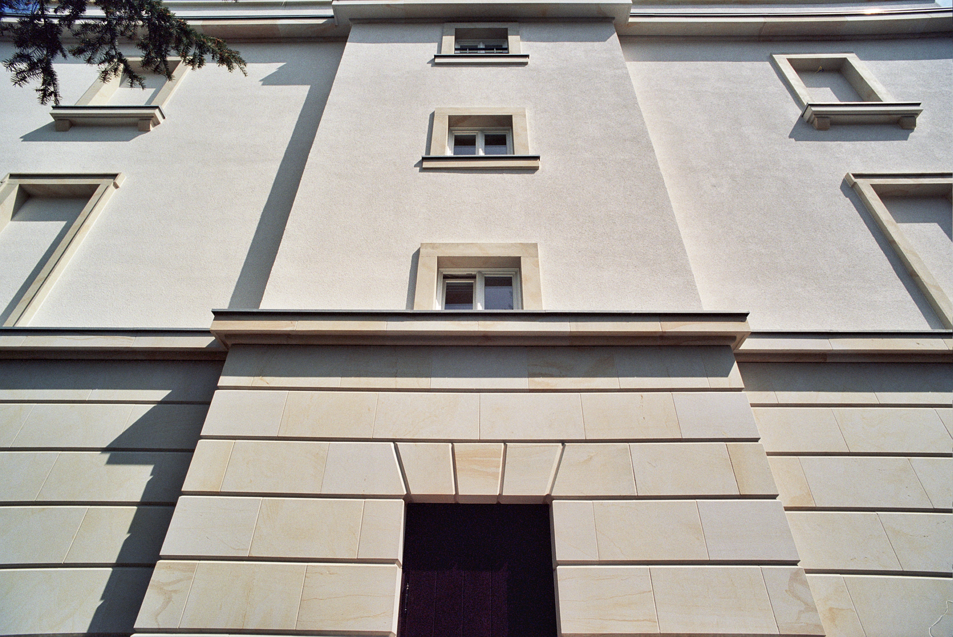 Alle Fenster-Gewände der Fassade wurden zusätzlich profiliert. "Dafür haben wir extra Brettprofile angefertigt", sagt Liedtke, "die farblich vom Hauptfassadenton in Sandsteingrau abgesetzt wurden. Insgesamt sind 296 laufende Meter Dekorprofile eingesetzt. Sie sind mit einer tieftemperaturelastischen, rissüberbrückenden PCC-Flex-Schlämme beschichtet. Dieses Produkt (Disbon 519) ist zweikomponentig und kunststoffmodifiziert. Der Schutzanstrich ist mehrfarbig und wurde als Marmorierung ausgeführt. Er orientiert sich hinsichtlich seiner Optik am Erscheinungsbild der Originalsteine.