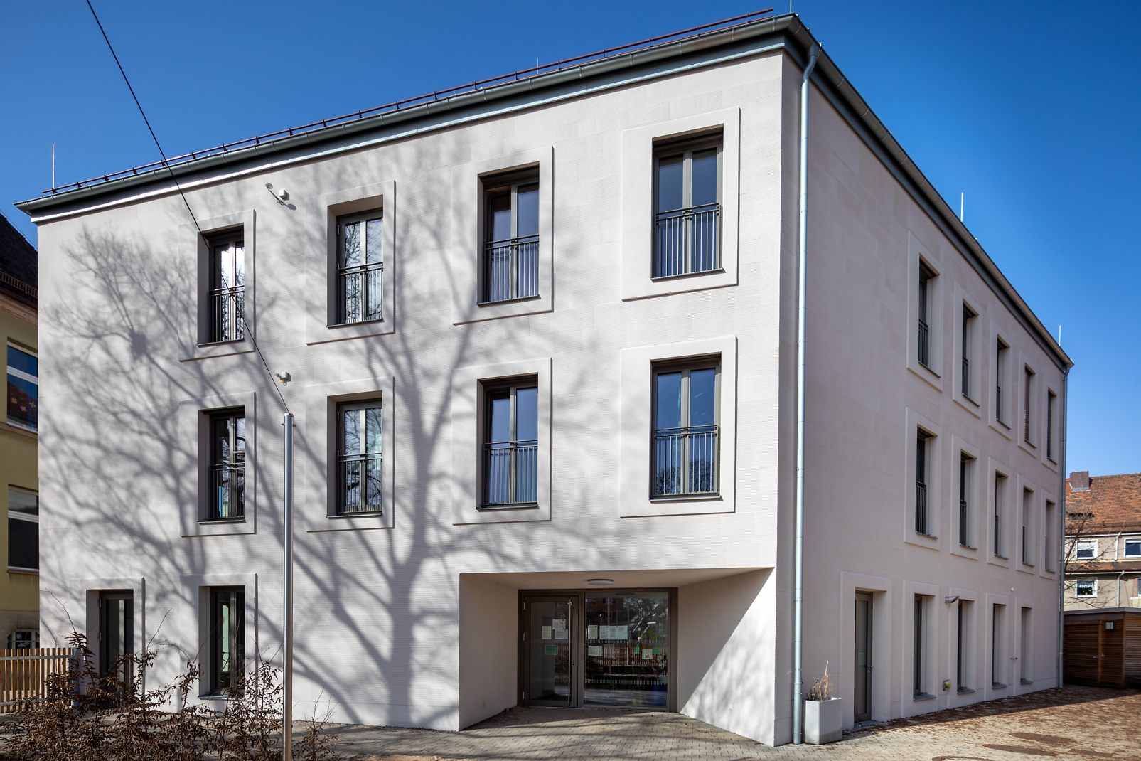 Kammzug, Besenstrich und ähnliche handwerkliche Strukturtechniken setzen eine gewisse Putzstärke voraus. Inzwischen ist Schwerkraft zwar nicht abgeschafft, aber besser im Griff. Zumindest bei den Capatect Fassaden-Dämmsystemen von Caparol. Dort hat man eine ganze Reihe von Strukturen WDVS-konform entwickelt, getestet und ins Portfolio aufgenommen. Dazu gehört natürlich der Kammzug, natürlich der Besenstrich, aber auch der Kellenschlagputz, natursteinähnliche Anmutungen bis hin zur exotischen Krokodilhaut-Optik. Der Blick in die Datenblätter zeigt, welche Lasten das Dämmsystem aufnehmen muss: Je nach Struktur werden bis zu 3,5 Kilogramm Putz pro Quadratmeter aufgebracht, beispielsweise der mineralische Capatect Modellier- und Spachtelputz 134, der sich auch werksseitig in einem großen Farbenspektrum einfärben lässt. Wichtig ist, dass der Gesamtaufbau des Dämmsystems der Zulassung entspricht, was nicht heißt, dass eigene Abwandlungen der Putzstruktur durchaus machbar sind. Mitunter geben sie sogar den Ausschlag für die Beauftragung – so wie beim Kinderhort in Nürnberg, dessen Kammzug-Variante vom Fachhandwerker selbst erdacht wurde.