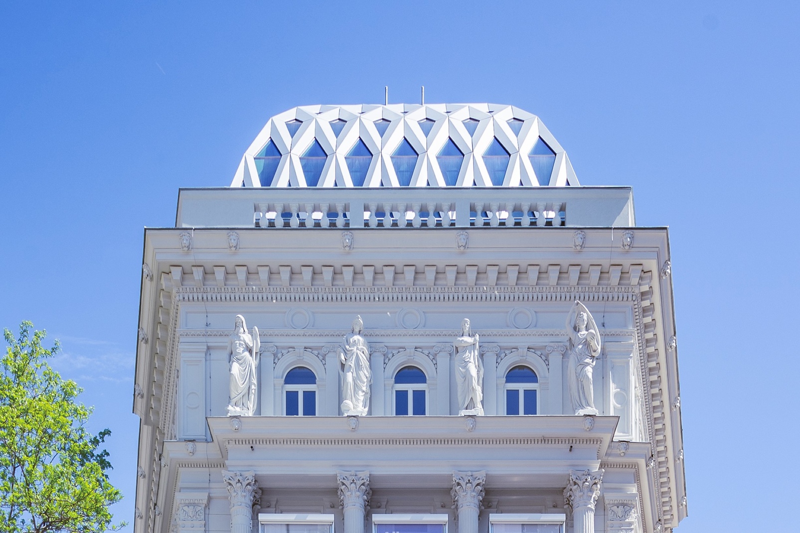 Neben der Anpassung an moderne Hotelstandards bekam das Gebäude einen gläsernen Dachaufbau: In dieser Faltkuppel nach den Plänen des Wiener Architekten Arkan Zeytinoglu thronen zukünftig Restaurant und Bar, die neben den Hotelgästen auch für die Öffentlichkeit zugänglich sind. Augenmerk legte man auf die authentische Revitalisierung der Fassade. Das 1870 von Eduard Kaiser und von Michael Kummer erbaute Hotel hat einen fünfgeschossigen streng historistischen Fassaden-Aufbau. Diesen Auftritt galt es so unverfälscht wie möglich wiederherzustellen. Besonderes die Sanierung der Frontansicht mit ihren Balustraden, Bogenfenstern und dem üppigen Fassadendekor bedurfte hoher fachlicher Kompetenz.